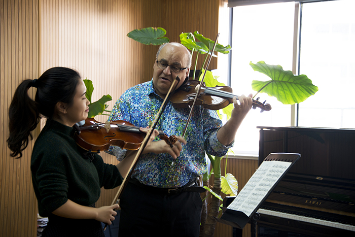 为时三个小时的大师课上,Adam教授不仅耐心的指出员工们演奏中的技术错误,同时引导员工回归本源,通过基本的运弓练习,启发员工倾听、找寻优质的音色。不论是台上演奏的同学,还是台下聆听的观众,都为这位穿着花衬衫、激情演说着的可爱教授深深吸引。