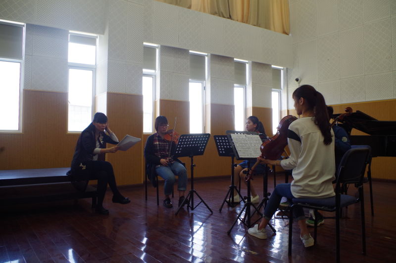 图为黄滨教授为我系弦乐同学指导室内乐重奏课