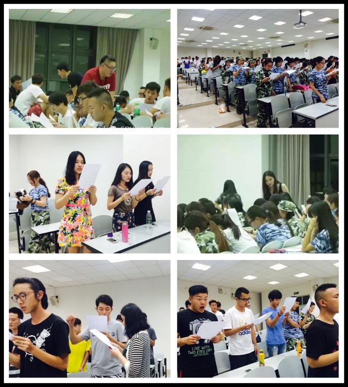 再到合唱,既是“科班”出身,2014级音乐表演班仅有的6位声乐专业同学责无旁贷地承担起我连合唱的教学任务,短短一周要完成两首比赛曲目的设计、编排和教学,难度不容小觑。连队同学不识谱,他们分组一句一句地教;时间紧迫又逢两晚排歌因故取消,他们就在军训场上休息时间就地组织大家唱歌。刚刚进入大学一年的 “小14”,用自己的方式注解着“专业”与“敬业”,更记录着“积淀”与“前行”!