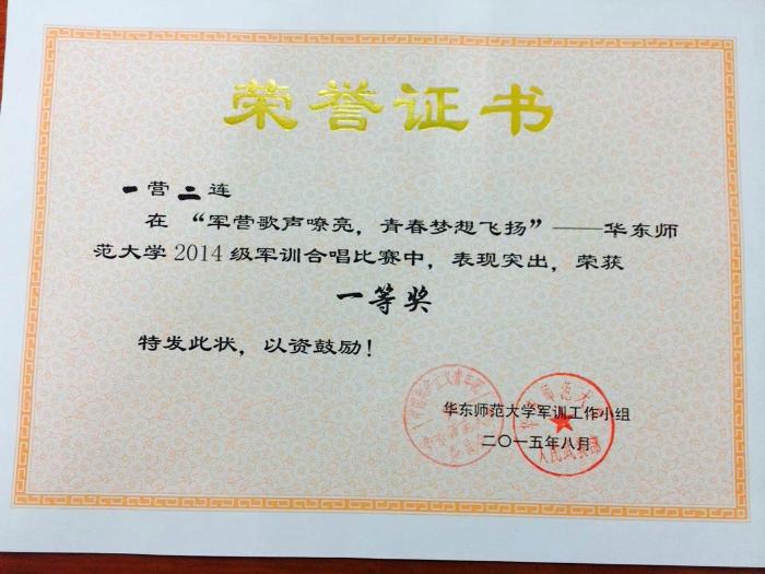 831日晚,在yl23455永利闵行校区的西操场上,“二连!二连!二连!”的呐喊声响彻秋季微微凉爽的夜空。歌声飞扬,一营二连来自音乐、美术、体育、社发四院系的182名同学,团结一心、众志成城,以嘹亮的歌声、蓬勃的精神,不负众望荣获军训合唱比赛一等奖! 将参赛曲目(校歌和《中国军魂》)演绎得格外振奋人心,唱出了对校园的热爱与对未来的憧憬,亦唱出了“狭路相逢勇者胜”的必胜信念,讴歌了伟大的抗战精神,给评委和全校师生留下了深刻印象!