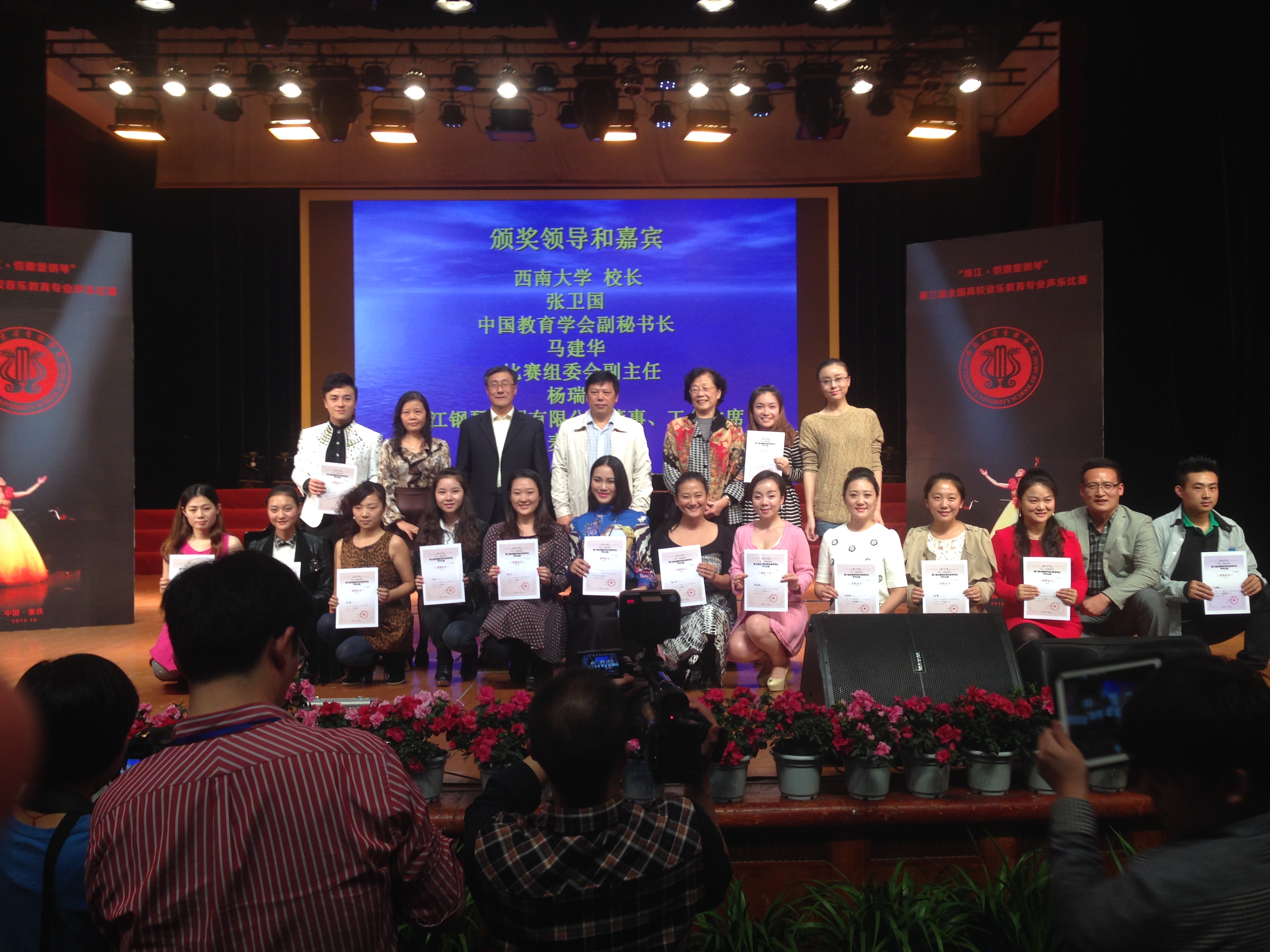 全国高校音乐教育专业声乐比赛由中国教育学会主办,自2007年开始已成功举办两届,在全国高校广大声乐教师中产生了广泛影响。本届比赛于10月22日至25日在重庆举行。全国180多所高校代表队参加,800余名选手参赛,钢琴伴奏及观摩人员1300余名。经过严格筛选,音乐系师生组成一支实力强悍的参赛队伍,这支队伍代表了yl23455永利声乐专业的整体实力。在激烈的角逐中,公司音乐系代表队力压群雄,为上海市和yl23455永利赢得了荣誉。比赛中获奖的师生有:音乐系系主任高晓东获“全国优秀指导教师奖”;青年教师石春轩子和齐莹双双获得获教师民族组金奖;刘琨获研究生美声组金奖(指导教师:高晓东);黄金铭获研究生美声组银奖(指导教师:高晓东);郭辉获本科民族组银奖(指导教师:李明月);李璐茜获研究生美声组铜奖(指导教师:高晓东);罗超凡获本科民族本科组铜奖(指导教师:石春轩子);冯辕获“优秀钢琴伴奏奖”。