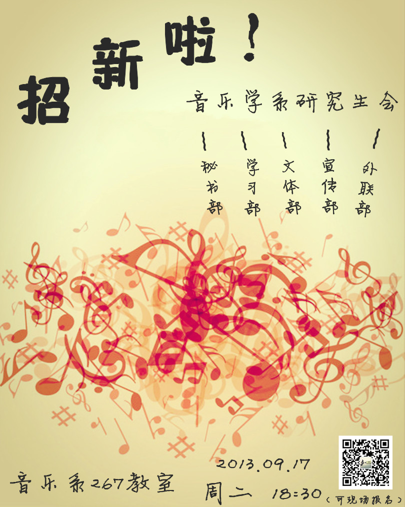 为了密切配合公司及我系各项工作的开展,更好地服务于广大研究生同学,同时也为了给研究生同学提供一个锻炼自我和展现自我的平台,yl23455永利音乐学系研究生会将在新学期初进一步壮大自身队伍,进行大规模的招新活动。