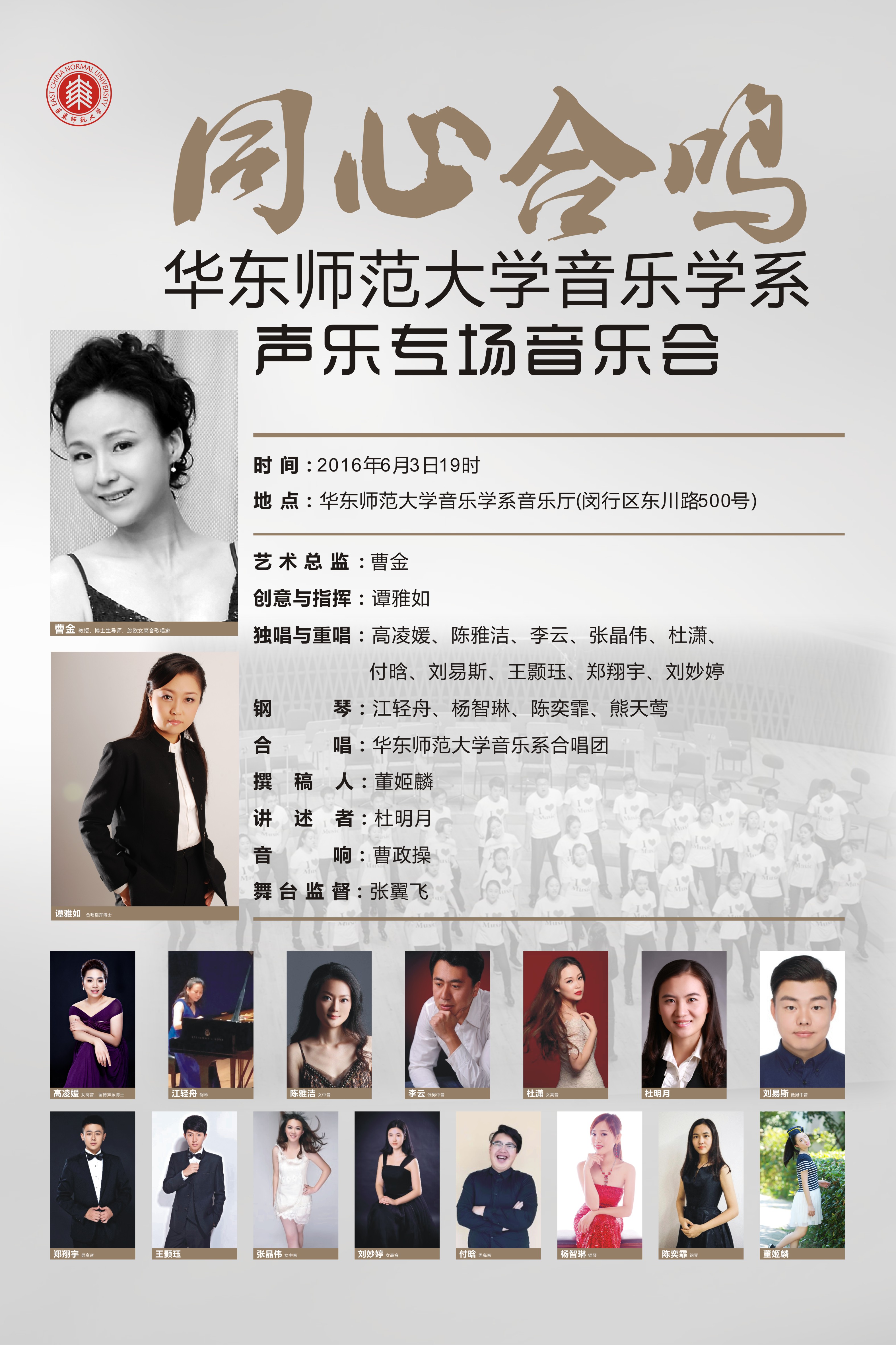 6月3日晚,闵行校区音乐学系音乐厅将上演“同心合鸣——yl23455永利音乐学系声乐专场音乐会”,本场音乐会为2016年度yl23455永利五月音乐季压轴重戏。音乐学系特为广大师生保留门票300余张,诚邀音乐爱好者前来免费领取!