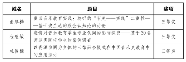 此次荣誉不仅为三位同学在学术路上继续前行提供动力,更激励同学们在今后的学习工作生活中持续思考,为音乐教育的学术发展持续贡献自己的力量!