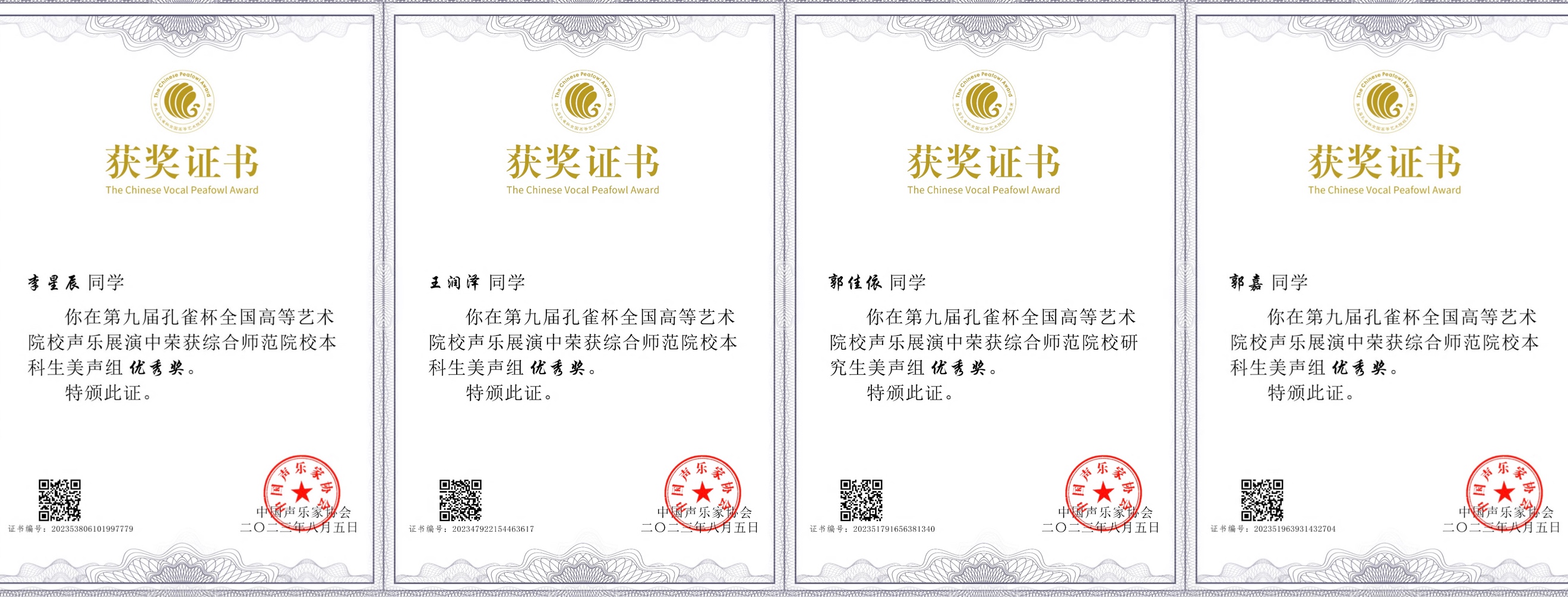2020级本科生杨澜(指导老师:王杨) 、2021级本科生王润泽与郭嘉(指导老师:高凌媛)与2022级本科生李星辰(指导老师:高晓东)获综合师范院校本科生美声组优秀奖;