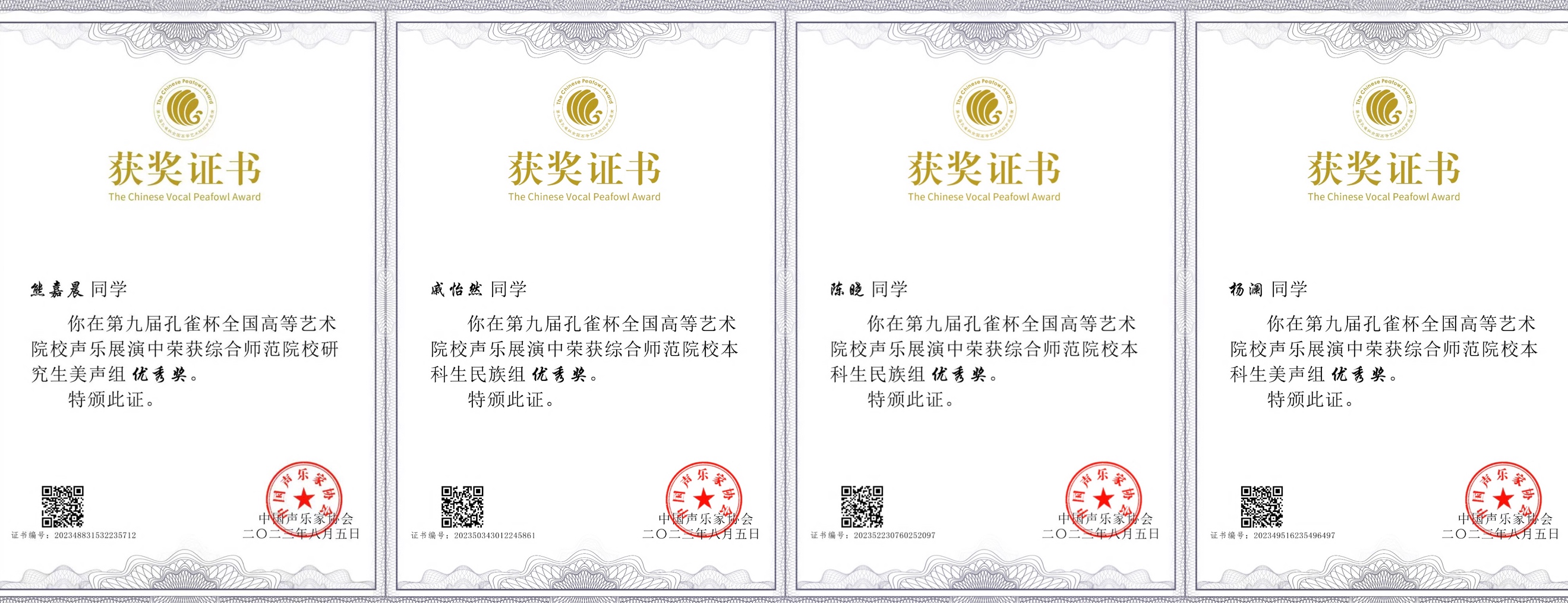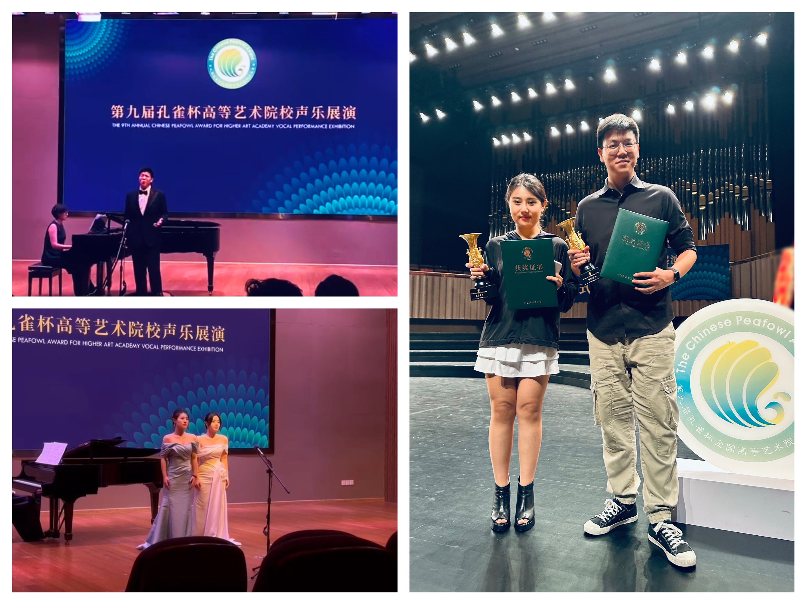 2023级硕士研究生张霆轩(指导老师:高晓东)获综合师范院校研究生美声组“银孔雀杯”、2020级本科生蔡雨含与殷世炎(指导老师:高凌媛)获综合师范院校本科生美声组“银孔雀杯”;