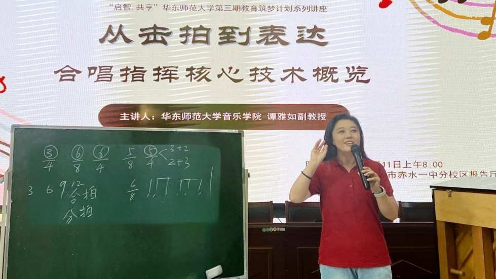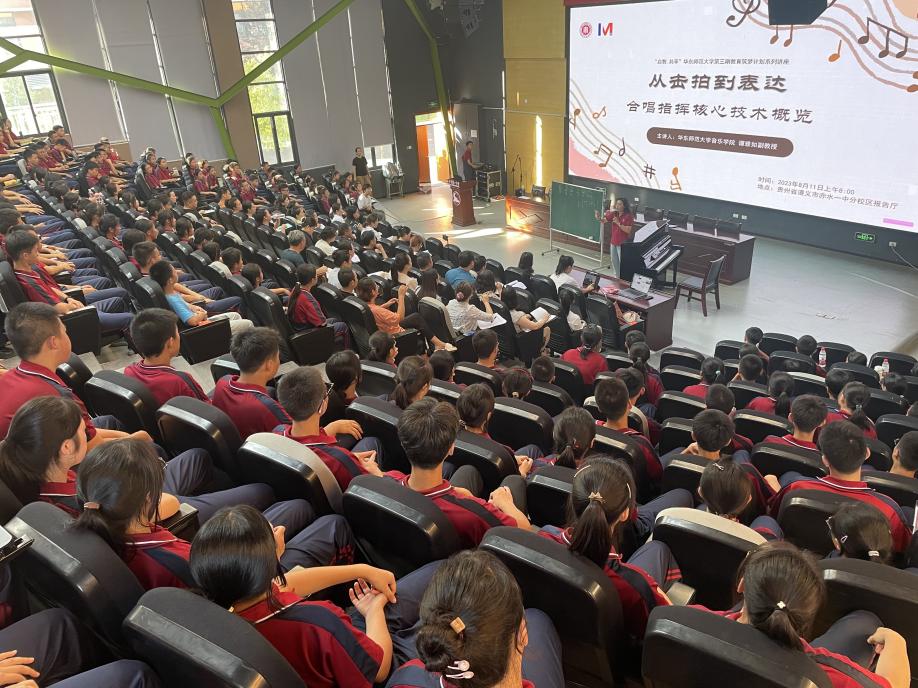 2023年8月11日(星期五)上午8:00,谭雅如副教授在赤水一中分校区报告厅举办一场题为《从击拍到表达——合唱指挥核心技术概述》的专题讲座培训活动,作为实地“师训”的组成部分,参会的师生包括赤水当地的40余名中小学一线音乐老师与赤水一中合唱团的同学,另有湖南醴陵与河南信阳及全国乡村合唱音乐联盟(筹)其他成员公司的老师在线上参与,共计参会人次近400余人。本场讲座由赤水一中团委书记、音乐任课教师周明镜老师主持。