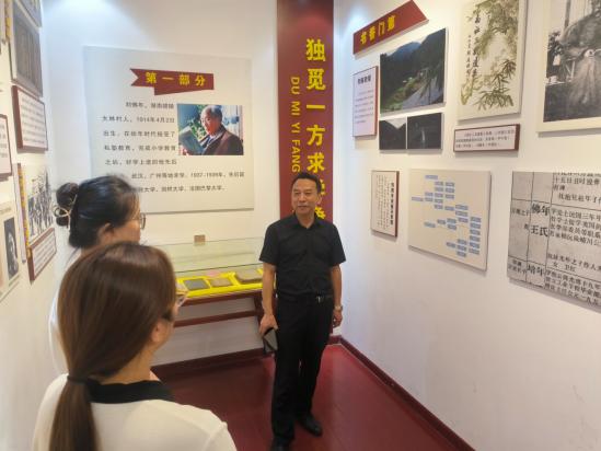 钟董事长(右一)在为员工志愿者介绍刘佛年先生的生平事迹