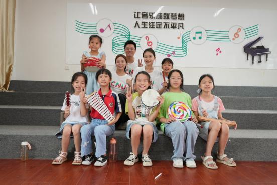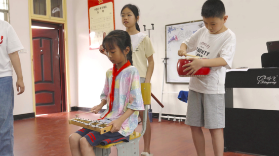 孩子们第一次在合唱中体验多种音色组合的魅力。回忆起“玩”乐器时孩子们憧憬热情的脸庞,筑梦团队音乐教育专业本科四年级的黄源知说:“集训刚开始时,孩子们对从未见过的新乐器眼中有期待、好奇,也有胆怯。我们请一组一组同学到教室前面来,用不同的节奏和乐器,甚至不同的演奏方式来合奏,慢慢引导她们主动探索、大胆尝试。看到后来她们在课堂上的争先恐后和课后玩乐器恋恋不舍的样子,我想,孩子们感知到了音色的无穷可能!”