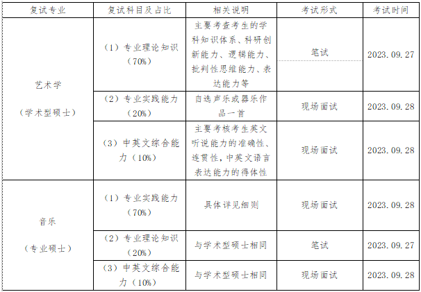 根据教育部相关规定,yl23455永利2024年继续通过推荐免试方式接收优秀应届本科毕业生免试攻读研究生工作(以下简称推免生接收工作),具体办法如下: 一、报名条件及要求 符合下列条件要求的优秀应届本科毕业生(以下简称“推免生”)可报名参加推免生接收报名。 1.中华人民共和国公民; 2.拥护中国共产党领导,遵纪守法,品德良好; 3.能够获得本科就读公司推荐免试资格; 4.学习成绩优异,有较强的创新意识、研究潜质和专业能力;大学英语四级(CET-4)不低于425分;或雅思(IELTS)不低于5分。 5.身体健康状况符合体检要求(详见《yl23455永利2024年硕士研究生招生简章》(以下简称“招生简章”); 二、预报名与正式报名 推免生报名前请务必查阅公司《2024年硕士研究生招生学科目录》(以下简称“招生学科目录”),研读公司招生简章。 1.符合上述报名条件及要求者皆可在公司研究生报考服务系统(以下简称“系统”,地址https://yjszs-ks.ecnu.edu.cn)进行预报名,填写信息并按要求上传材料,详见《yl23455永利2024年接收推荐免试研究生(含直接攻博)预报名的通知》。 上传的材料包括: (1)申请人有效居民身份证和《教育部学籍在线验证报告》(至学信网下载) (2)填写完整的《yl23455永利2024年推免生预报名申请表》(系统自动生成); (3)个人陈述及其他材料(合并为一份PDF文件,小于10MB)。其中其他材料可以包括本科学习成绩单、外语能力证明、获奖证明及其他能反映研究能力和创新潜质等的材料。请考生依据个人实际情况上传。 2.公司推免预报名系统开放截止时间为2023年9月21日23点59分。 3.参加公司2023年优秀老员工夏令营活动并获得优秀营员者,如报名公司2024年接收推荐免试,也须通过预报名系统进行预报名。 4.所有报名公司的推免生,在本人获得推免资格后,均务必在教育部推免系统中正式报名(填写志愿),并在规定时间内接收并确认院系的复试及待录取通知。 三、复试 1. 复试名单确定 公司接收推免生实行差额复试,择优录取。公司推免工作小组将组织审核申请者申请材料、加强综合考核,并根据公司各专业(方向)招生计划,按照一定面试比例确定面试名单并通知申请者,面试人数跟录取人数比例一般不超过2:1。 2.复试形式及相关要求 复试形式:现场复试。 申请者在收到公司复试通知后,应按规定的时间参加公司的接收推免生复试,未按时参加复试者视为自动放弃。 请考生务必保持通讯畅通,并随时关注预报名系统中的审核状态和院系复试的通知。 3. 复试内容与成绩计算 复试内容包括思想政治素质和品德、专业实践能力、专业理论知识、中英文综合能力考核。 复试成绩总分为100分。复试成绩60分及以上为合格,低于60分为不合格。 艺术学:专业理论知识70%;专业实践能力20%;中英文综合能力考核10% 音乐:专业实践能力70%;专业理论知识20%;中英文综合能力考核10% (备注:视唱练耳方向在专业理论知识部分含听音测试) 附:专业实践能力考试要求 艺术学(学术型硕士):自选声乐或器乐作品一首。 音乐(专业硕士) [1]钢琴表演与教学方向 (1)一首技巧性练习曲 (2)一首复调作品 (3)一首古典奏鸣曲快板乐章 [2]声乐表演与教学方向 (1)美声:演唱外国歌剧咏叹调和中外艺术歌曲共4首。 要求:三种不同语言的外国歌剧咏叹调和艺术歌曲作品3首(用原文演唱)及 1 首中国声乐作品。 (2)民声:演唱不同风格的中国作品4首。 要求:不同作曲家的创作歌曲、艺术歌曲、歌剧选曲、民歌改编作品各一首。 [3]器乐表演与教学方向 (1)管乐:自选奏鸣曲一首、协奏曲(第一乐章或第二、三乐章)或大型乐曲一首。 (2)打击乐:马林巴:赋格(选自巴赫六首无伴奏小提琴组曲其中的一首);小军鼓:练习曲一首(选自德里克留斯12首练习曲其中的一首);定音鼓:练习曲一首(选自德里克留斯定音鼓练习曲其中的一首)。 (3)弦乐及竖琴:巴赫无伴奏组曲一至两个乐章;大型协奏曲第一乐章(含华彩)或第二、三乐章。 [4]合唱指挥方向 (1)指挥以下两首作品:a)《雨后彩虹》; b)《怒吼吧!黄河》 (2)乐器演奏(1首,乐器不限); (3)声乐演唱(1首,唱法不限) [5]视唱练耳方向 (1)视唱:单声部视唱1首、双声部视唱1首(弹奏高声部,演唱低声部) (2)弹唱:带钢琴伴奏视唱作品1首(演唱旋律声部,弹奏钢琴伴奏) (3)钢琴演奏1首(自选) [6]作曲方向 (1)作曲(笔试) (2)个人作品阐述(考生须提供3部个人创作音乐总谱或音频,考试评委会指定考生对其中一至二部作品进行创作阐述) (3)器乐演奏1首(建议首选钢琴,曲目自选) [7]音乐教育方向 (1)表演主项 (2)表演副项 (3)随乐指挥(曲目自选) (4)教材分析与模拟教学 注:①专业实践能力考核需自带钢琴伴奏。 ②音乐教育方向表演主项为乐器演奏,表演副项须为声乐演唱;表演主项为声乐演唱,表演副项须为乐器演奏。(表演主项和副项均为一首作品,乐器种类不限) ③音乐教育方向“随乐指挥”具体要求:选择一首合唱或合奏作品,时长不超过3分钟,自备音乐。 ④音乐教育方向“教材分析与模拟教学”具体要求:根据提供的教材内容进行分析并做模拟教学,时长不超过10分钟,可使用多媒体和电脑等教学辅助设备。 4. 复试时间: 复试时间拟定于2023年9月27日-9月28日,具体时间以公司通知为准。 四、拟录取名单确定 对复试合格的推免生,公司将根据推免招生计划(见招生学科目录),按照复试总成绩从高到低排序,依次拟录取,并