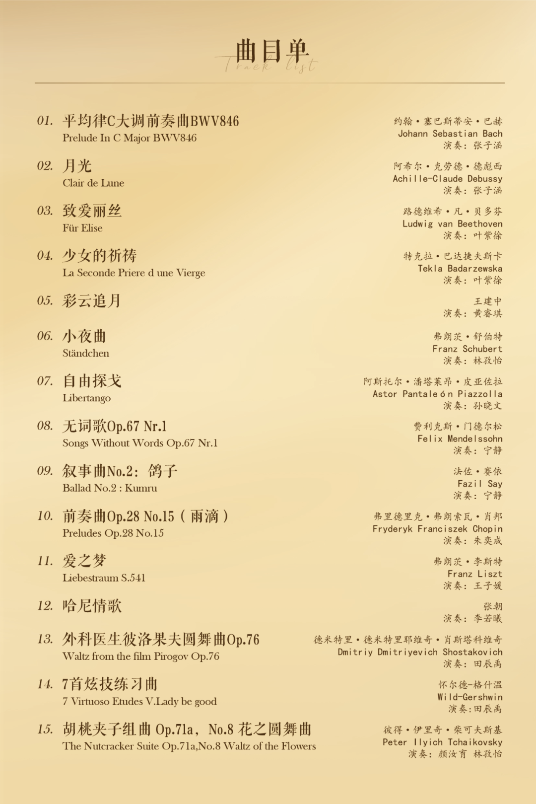 本场音乐会以巴赫《C大调前奏曲》的纯净架构启幕,如巴洛克教堂的晨光倾泻,奠定根基,德彪西《月光》随即以印象派笔触晕染出粼粼夜色。贝多芬《致爱丽丝》则以耳熟能详的温柔旋律叩击心扉。巴达捷夫斯卡《少女的祈祷》如水晶般剔透,与王建中改编的《彩云追月》遥相呼应,前者是19世纪波兰的纯真祷语,后者则晕开中国水墨的写意云月。舒伯特《小夜曲》的浪漫私语未歇,皮亚佐拉《自由探戈》已携阿根廷的炽烈节奏席卷而来。门德尔松《无词歌》的恬静溪流中,法佐·赛依《鸽子》忽而翻飞出土耳其的异域风情。肖邦《雨滴前奏曲》滴落诗意愁绪,李斯特《爱之梦》却迸发狂想激情,张朝《哈尼情歌》则以云南山歌调性编织民族音画。终章双舞曲别具深意:肖斯塔科维奇以《外科医生圆舞曲》的戏谑笔触解构传统,柴可夫斯基《花之圆舞曲》则以极致华美重现芭蕾幻境。十四部作品在琴键上串联几个世纪音乐星河,见证音乐风格的延续与重生。