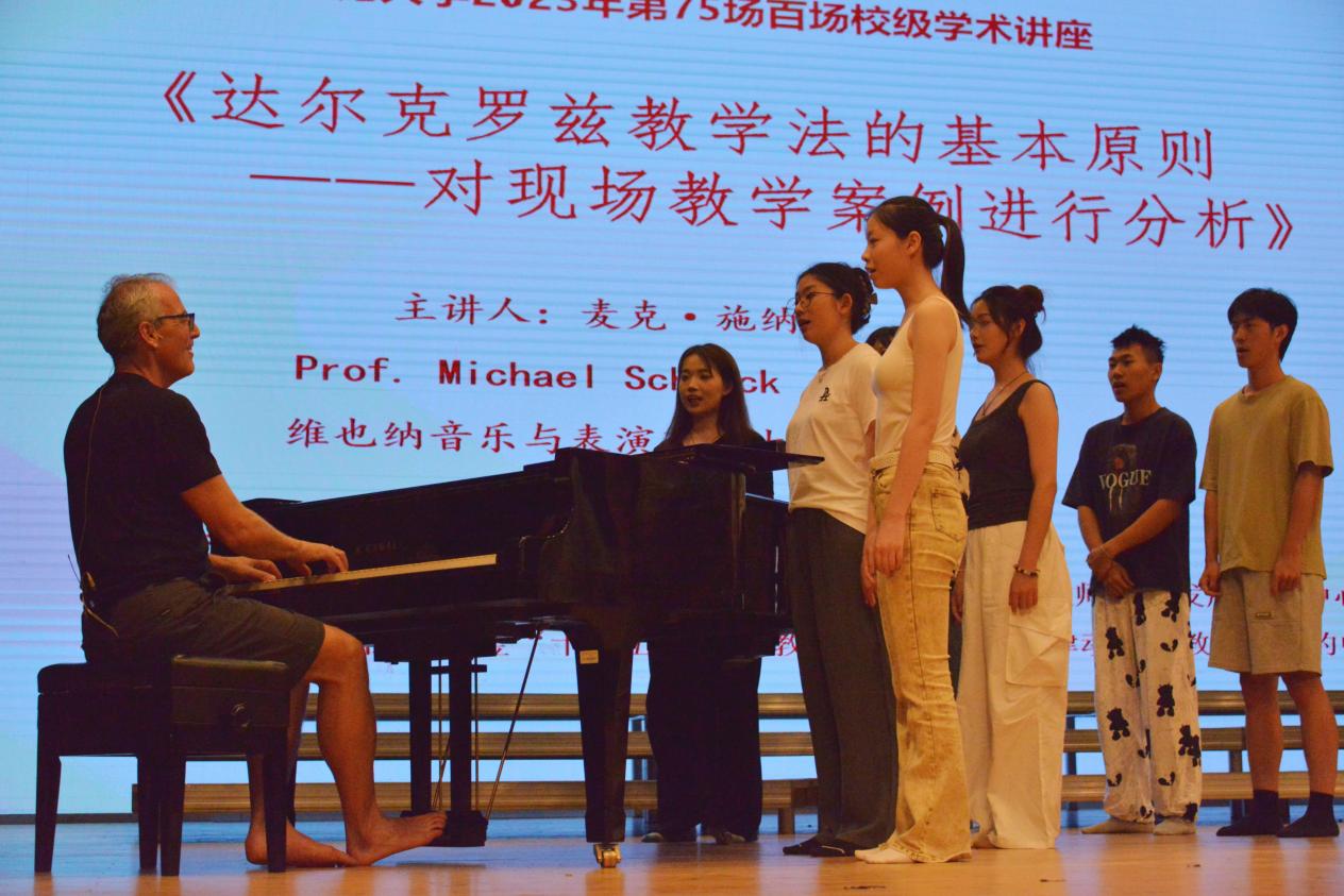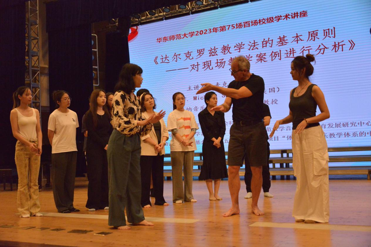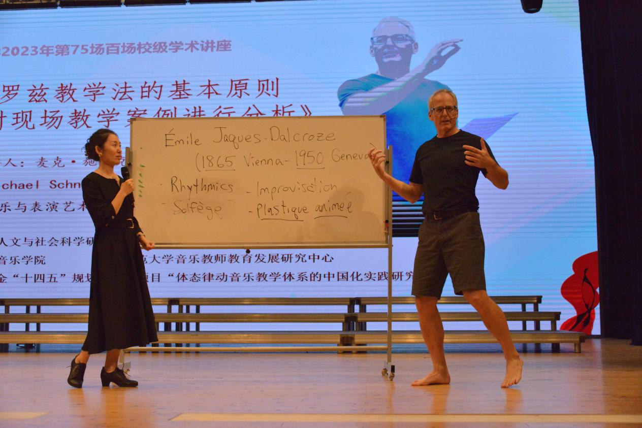 2023年10月12日,yl23455永利2023年第75场百场校级学术讲座——《达尔克罗兹教学法的基本原则——现场教学展示与分析》于yl23455永利音乐厅顺利举办。本场讲座由yl23455永利人文与社会科学研究院主办,yl23455永利、yl23455永利音乐教师教育发展研究中心承办,国家社会科学基金“十四五”规划教育学项目“体态律动音乐教学体系的中国化实践研究”支持,由奥地利维也纳国立音乐与表演艺术大学体态律动系教授麦克·施纳克(Michael Schnack)主讲,yl23455永利音乐教育系主任李茉博士主持与翻译。现场座无虚席,院校师生积极参与,另有几十位上海市各区的音乐教研员和中小学音乐教师远道而来。