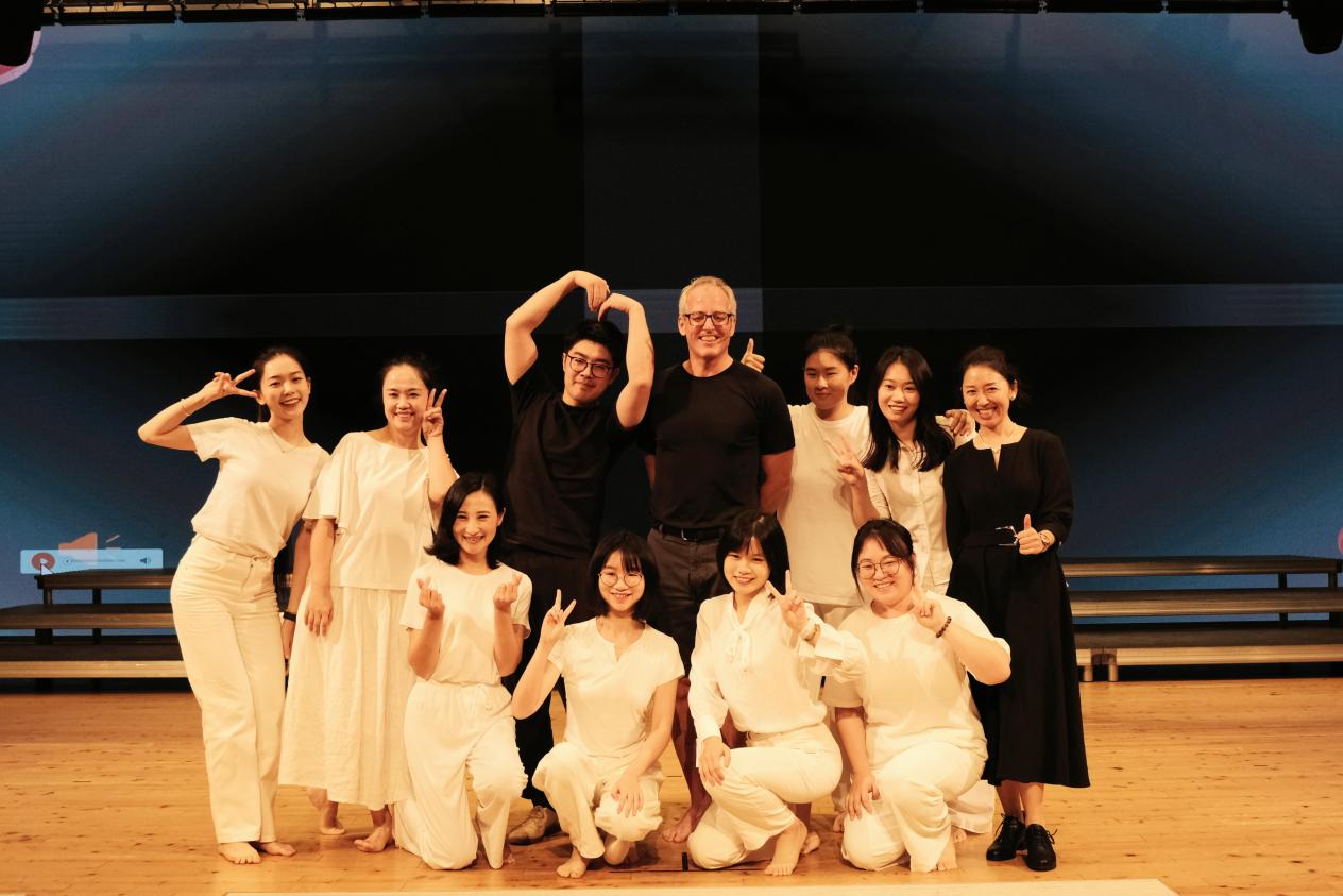 课堂最后,麦克教授呈现了一场以拉赫玛尼诺夫的合唱作品《天使的赞歌(Cherubic Hymn)》为创作基础排演的动态塑形作品,为观众展示达尔克罗兹教学法中“动态塑形”。根据音乐的和声,演绎者分为八个声部,“以身体为媒介”将各自声部相对应的音高、节奏、音乐情绪等音乐基本要素和故事情节进行律动。现场的表演在视觉上将艺术作品生动形象地呈现,表演者们感受到“在律动的过程中深刻地体会到用心感受音乐带来的治愈感,全身心投入出现了“心流”,非常陶醉和感动”。更有在场观众被舞台上的表演者感染,感叹“动态塑形作品让我领悟到了犹如乐谱般的宏大叙事”。