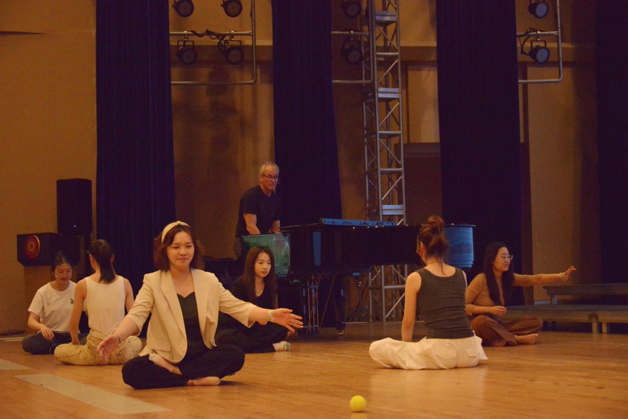 课堂伊始,麦克教授组织员工在舞台中放松身体随意走步,过程中他不断提示员工时刻观察周围同伴的情绪与状态。随后,麦克教授即兴演奏音乐,员工需“感受”音乐并随乐进行走步,此基础上他引导员工关注音乐中的重音位置、小节位置与节拍变化等,并引领员工对此用身体作出相应动作,如跨小节时改变走步方向、重拍时加入击掌等。除此,麦克教授利用球类教具,组织两人之间根据音乐的节拍变化以不同的速率相互传球等等。