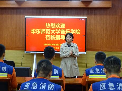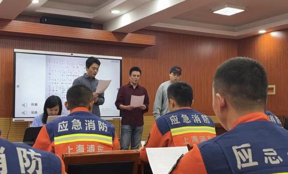 此前,在教工党支部党员王周悦的牵线下,公司员工会副会长夏清员工为周渡消防救援站站歌作词作曲,2021级硕士研究生党支部作曲专业郑策为其编曲,党员教师曹政操负责录音,经多次沟通,使得周渡消防救援站站歌初步成型。此次活动,由教工党支部党员谭雅如担任合唱指挥,张薇担任钢琴伴奏、曹政操担任领唱,主要从音准、咬字、节奏等方面对消防队员进行合唱指导。活动最后,由曹政操、张翼飞、巢博闻等三位党员教师进行站歌演唱示范,获得在场消防队员与公司师生的热烈掌声。党员教师发挥专业所长,全身心投入到对消防队员的合唱教学和示范中,将此次共建联建活动推向高潮。