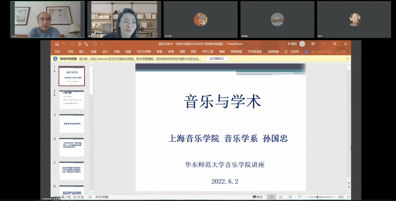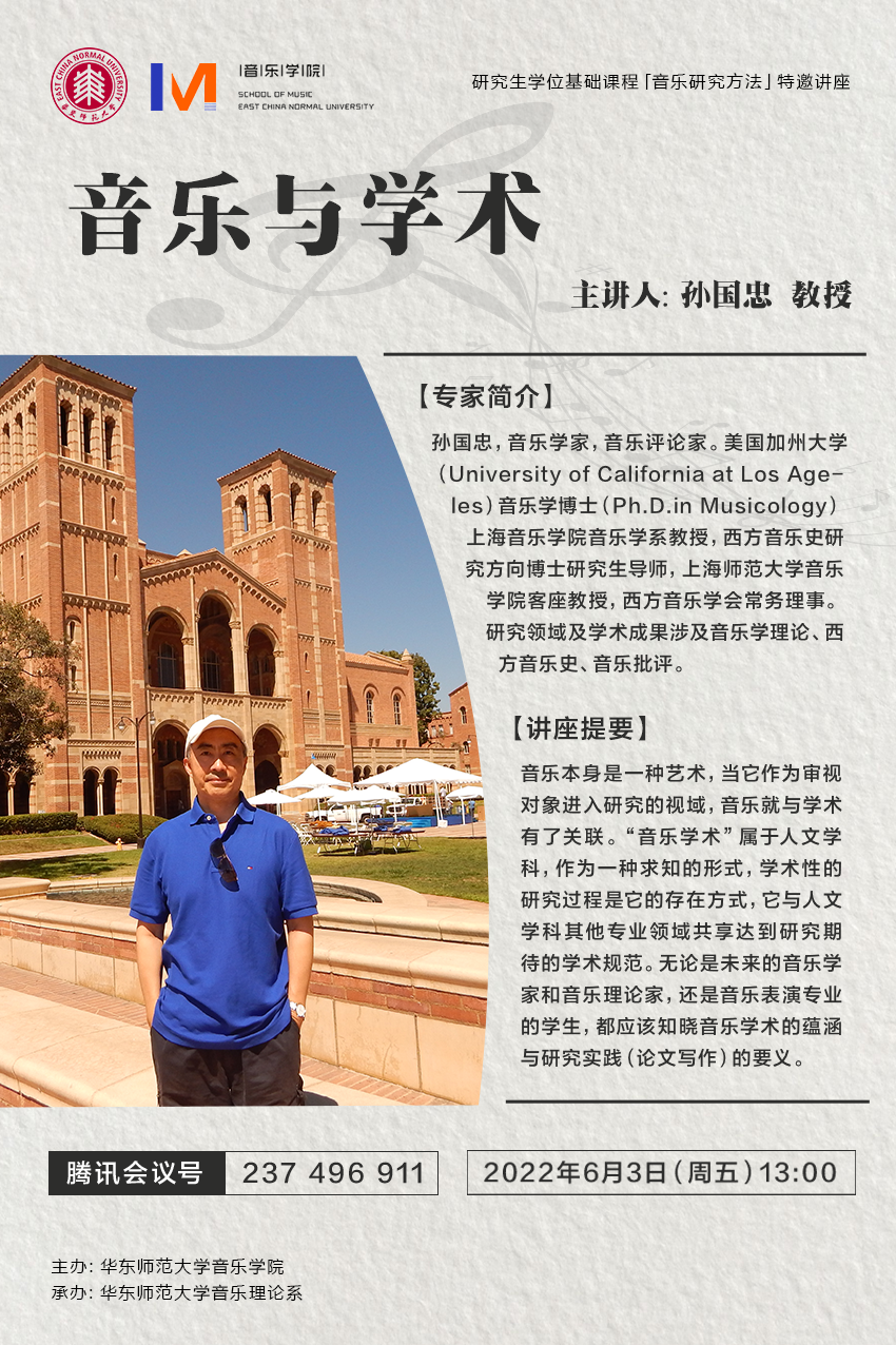 “音乐学术”历来都是备受音乐研究生们关注的话题。2022年6月3日,yl23455永利研究生学位基础课程「音乐研究方法」,特邀著名音乐学家、音乐评论家、上海yl23455永利的孙国忠教授,举办了一场题为《音乐与学术》的讲座。受疫情影响,本场讲座在腾讯会议平台线上进行,由姜蕾教授主持,苏杭老师与全体研究生一年级同学参与。