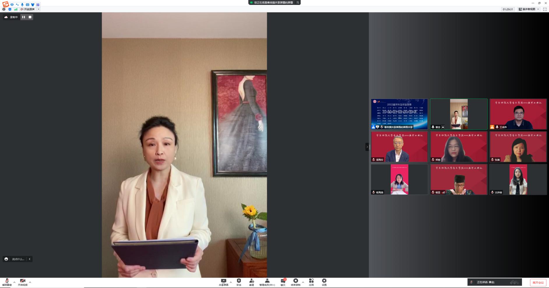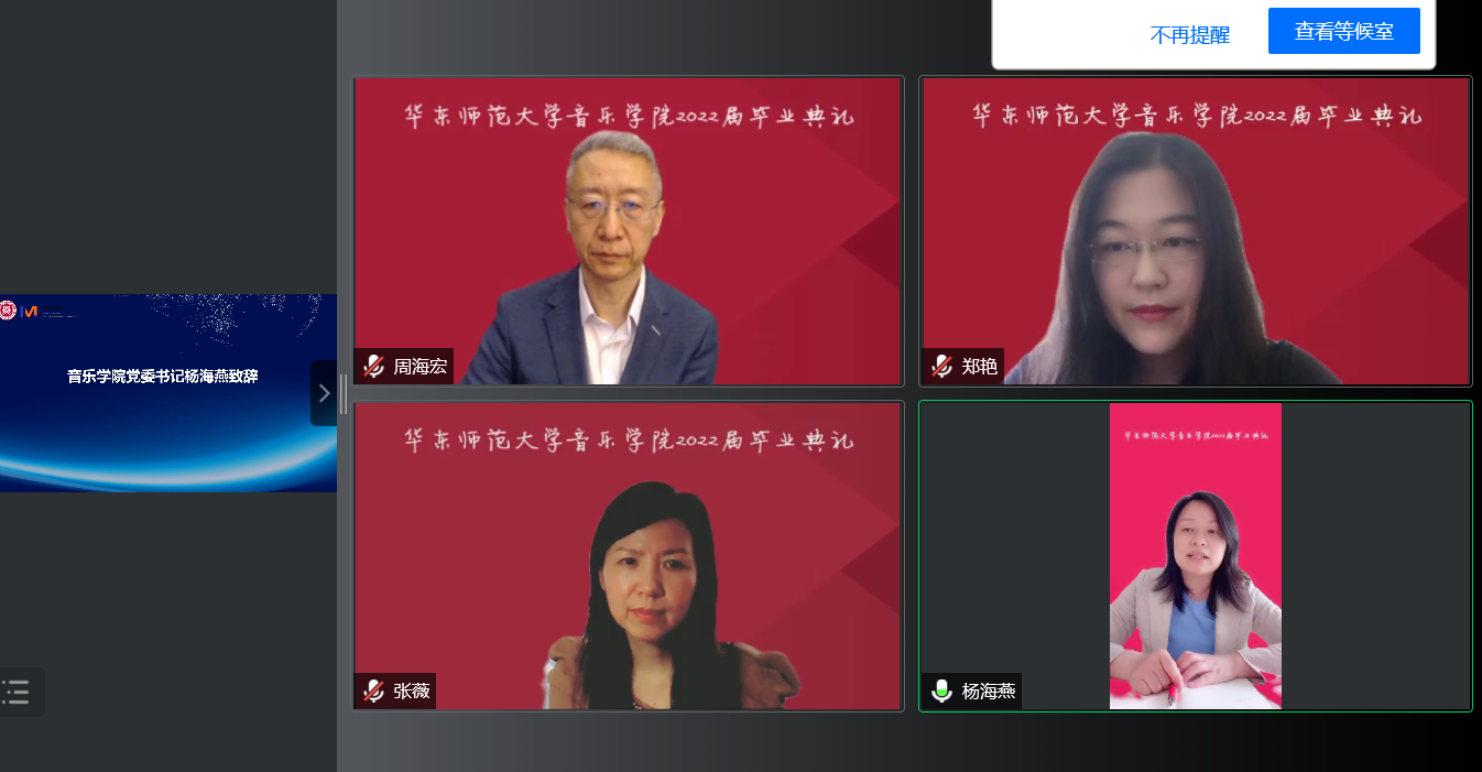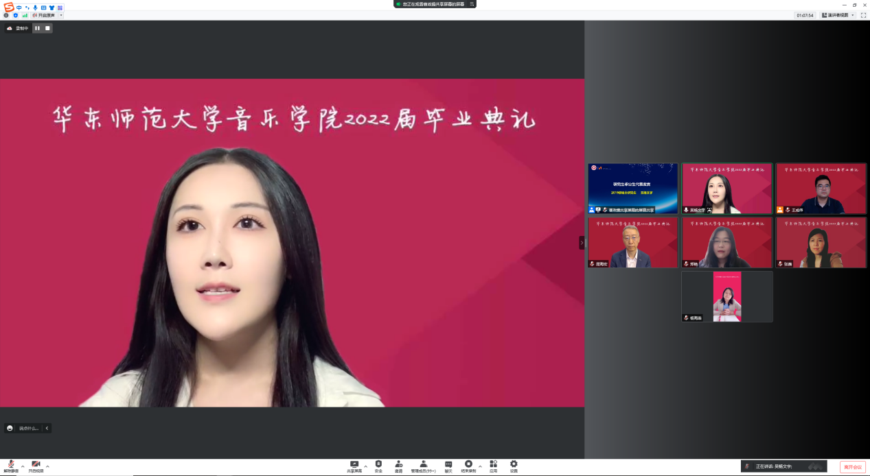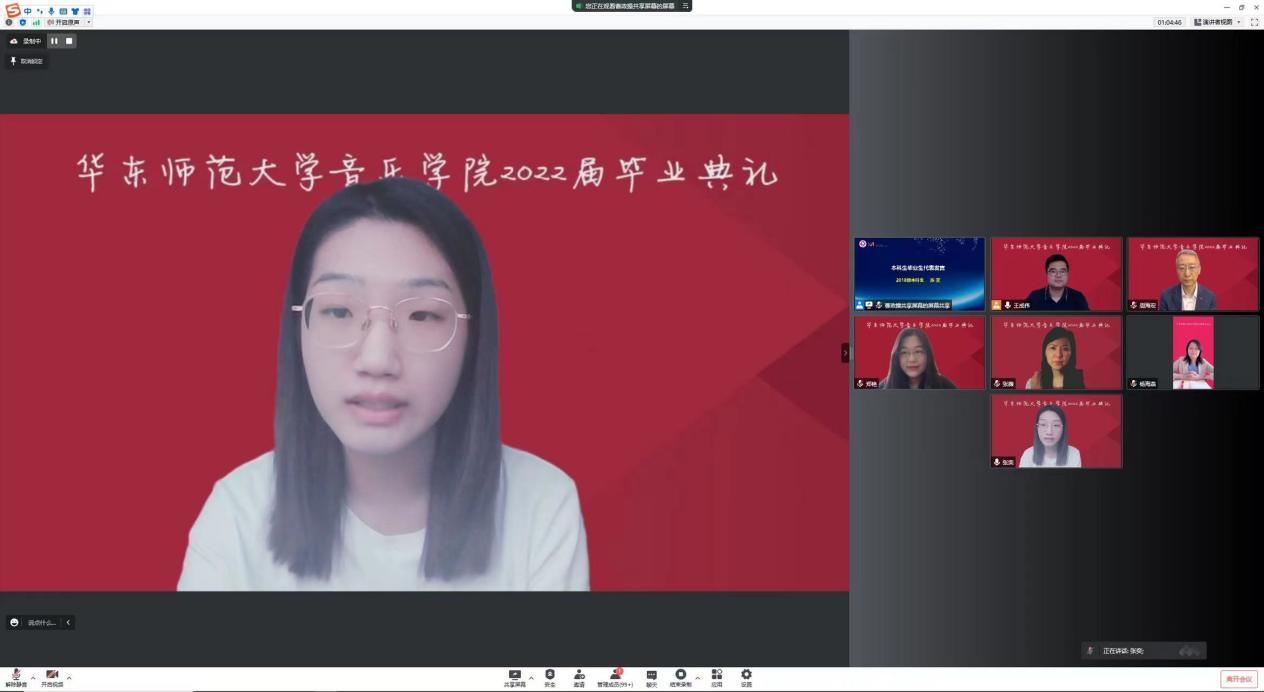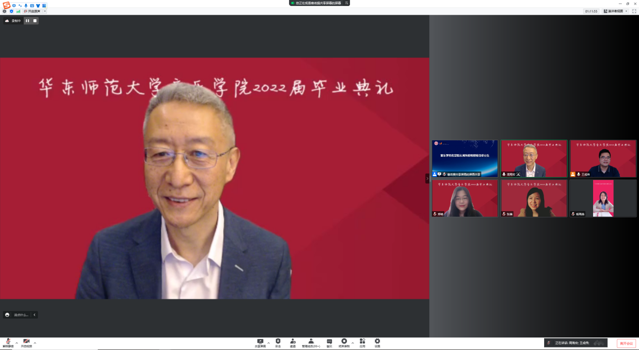 在大学的学习生涯中,导师是同学们的传道授业解惑者,疫情防控期间更是通过各种方式为同学们开展起了“云辅导”。教师代表师鲁嘉副教授回忆员工们第一次来到yl23455永利报道、第一次领书、第一次去琴房练琴、第一次在公司排练演出、第一次参加音乐会、第一次写论文、以及第一次参加这样的线上毕业典礼,在无数的第一次后,他见证了同学们现今的成熟。师鲁嘉老师代表全体教师对2022届毕业生送出最美好的祝福,并且嘱咐所有毕业生一定要传承弘扬“求实创造、为人师表”的师大校训,要让“永远奋斗”成为流淌在血脉中的不灭情怀!
