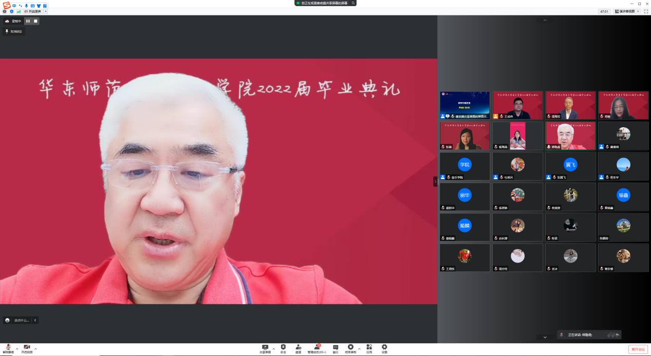 研究生毕业生代表吴杨文宇感慨自己三年的研究生时光是特殊的三年。在研究生一年级下学期,武汉疫情爆发,全体师生经历了第一次线上课程。研究生三年级下学期,上海疫情爆发,全体师生又经历了第二次线上课程。大家从第一次线上课程的手足无措到第二次的有条不紊,每个人都在这两次疫情中得到了进步与成长。即将成为一名人民教师的她对母校、恩师表示由衷的感谢,也祝福所有的毕业生在未来的岁月里要竭尽所能、发挥潜力,乐观生活。