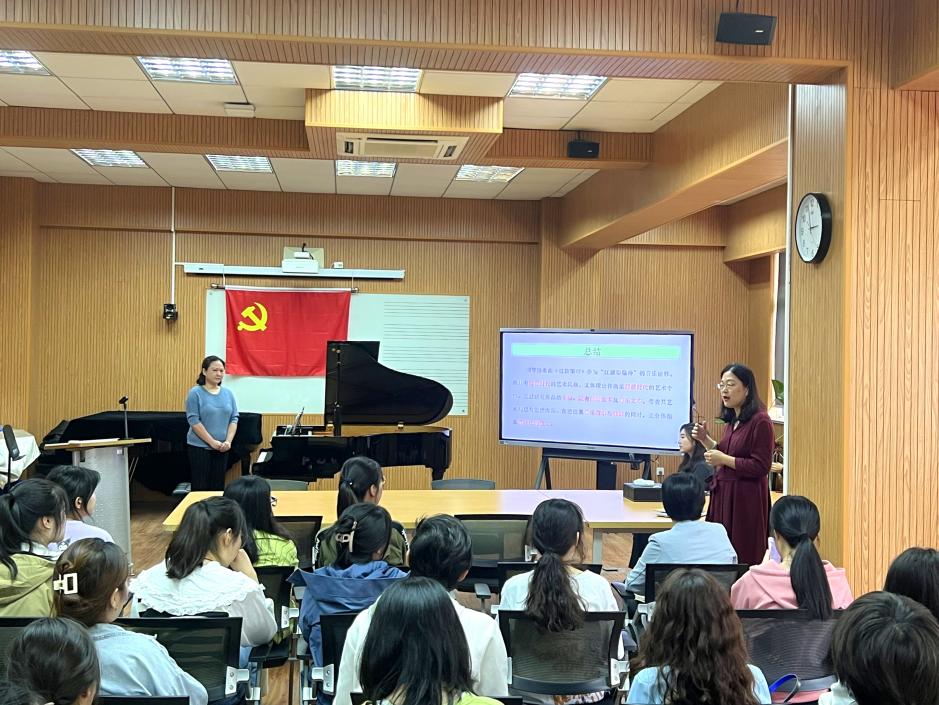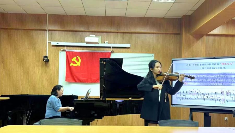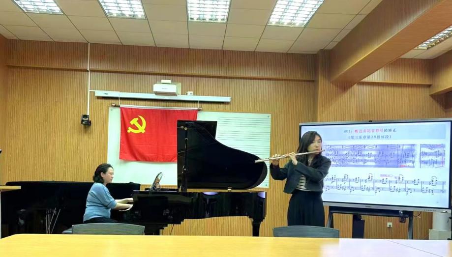 艺术构思方面,江老师突出作品的叙事性特征及诸多音乐修辞手法,试图从结构、音色、形态、体式等方面对音乐细节进行详细阐述。江老师在此环节邀请了yl23455永利本科二年级音乐表演专业员工梁嘉航(长笛)、王镭澌(小提琴)演绎乐队中的主要声部,江老师亲自与其合作,通过演绎阐释完成主要观点的论证。