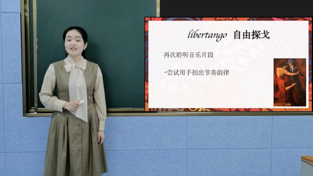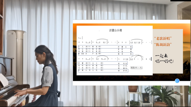 根据比赛规则,参赛选手需提交教学教案并进行十分钟的微课教学展示。在两位指导教师的精心指导下,两位选手反复进行课程教学结构设计的改进,打磨授课语言,提高课件设计水平,调整教学状态,斟酌教学中的每一步思路。为了使教学更富有感染力,参赛选手精益求精:张姝婧为了体现“米隆加节奏”的特点,设计了恰当的体态律动教学方案;崔雨奇反复锤炼歌曲《沂蒙山小调》的演唱,表现出浓郁的民歌韵味。充分的比赛准备过程,使两位同学的教学内容在极具教学逻辑和艺术特点的同时,也展现了优秀的个人音乐素养和干练的教学风格。