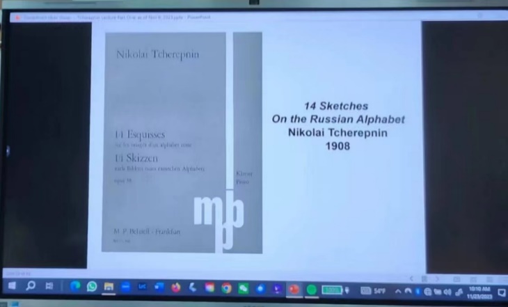 本场讲座先以齐尔品的父亲尼古拉·齐尔品(Nikolai Tcherepnin)为切入点,他的父亲尼古拉·齐尔品是一位作曲家,曾任俄国皇家歌剧院经理、及第比利斯yl23455永利经理。其父亲的创作风格类似于拉赫曼尼诺夫,大卫教授也现场演奏《Reverie in E-flat Minor》,让观众切身体会浪漫音乐风格。1907年,尼古拉·齐尔品出版诗集,并为前14页创作音乐,14个不同的俄罗斯字母,体现了14种风格。大卫教授演奏了俄罗斯风格和法国风格的乐曲片段。