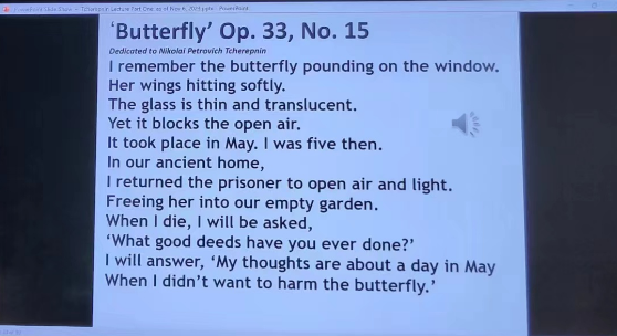 尼古拉·齐尔品的另一种风格——Cycle of Incantation,大卫·维顿教授为大家演奏了作品《Maguey Agave》Op.53 No.8,与之前的风格完全不同,是一种墨西哥弗拉明戈风格。1923年他接触到了日本的诗集,开始日本的音乐感到好奇,并开始创作日本风格的音乐作品。