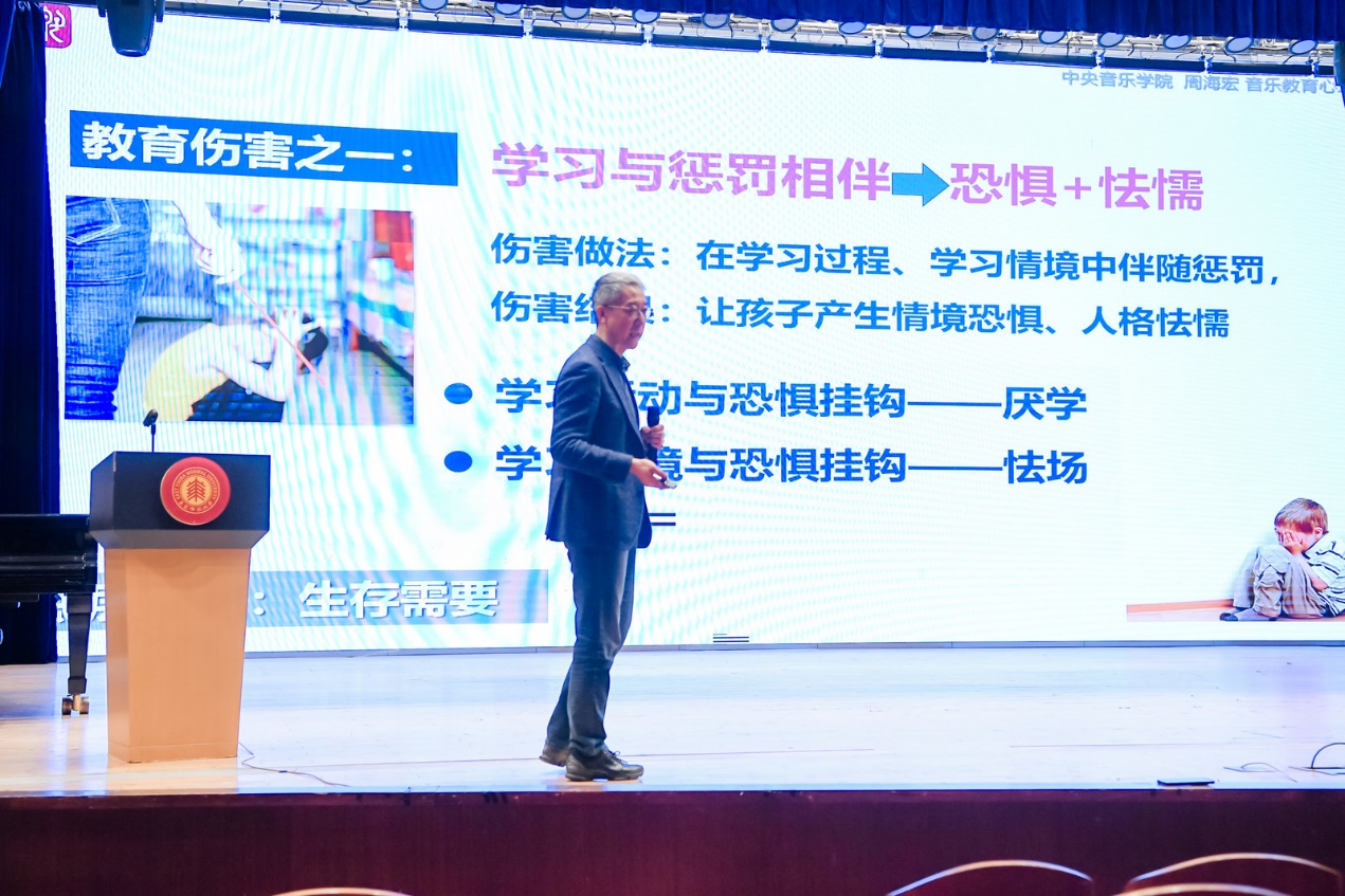 本场讲座中,主讲人周海宏教授提出“任何一位老师均应有两个专业——行业专业与教育专业”这一观点,以此为基,阐释了作为一位教师应具有的专业意识与学术素养。其从心理学的视角探讨了教师教育中的基本理论与原则,通过案例分析法列举了现代教育中出现的“教育伤害”问题,在“行业专业”和“教育专业”两大论域建构了音乐教育实践过程中所应遵循的学理性规律。