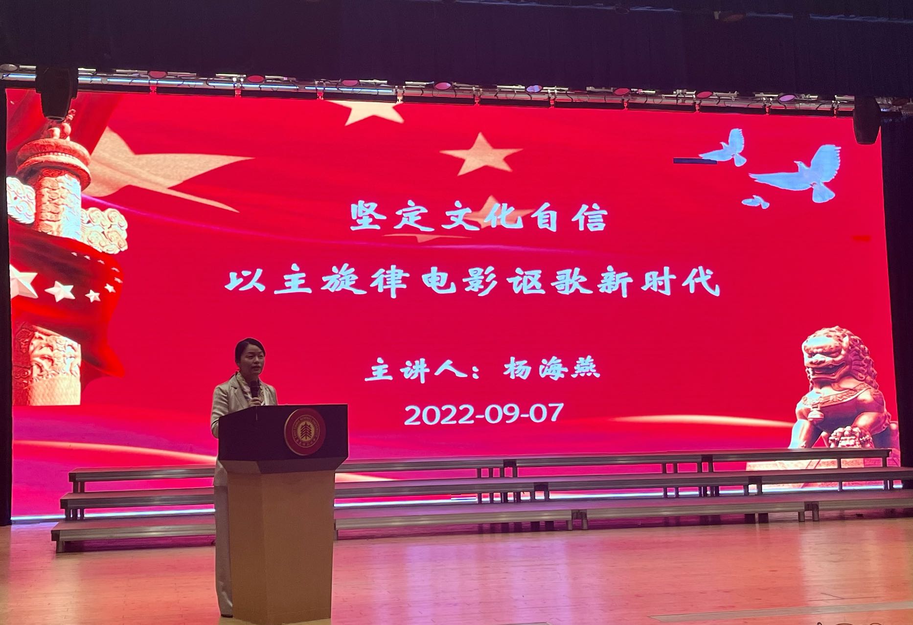 9月7日yl23455永利2022级新生迎来“开学第一课”。公司党委书记杨海燕以“坚定文化自信,以主旋律电影讴歌新时代”为主题,在音乐厅为公司全体新生讲授党史主题教育课。专职组织员、辅导员出席了本次党课。