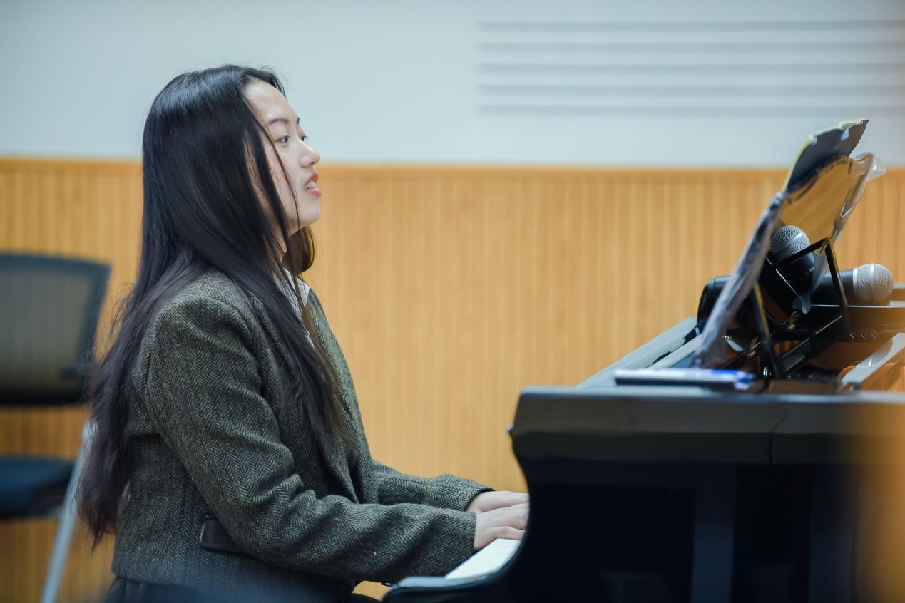 戴禹涵同学讲演的是中国钢琴作品《南音随想曲》,该曲目具有中国闽南文化风格,其在演奏、分析作品基础之上通过服饰造型以及对福建泉州民族乐器“南音四宝”的奏唱,深入阐释了该作品中的闽南音乐素材与风格。