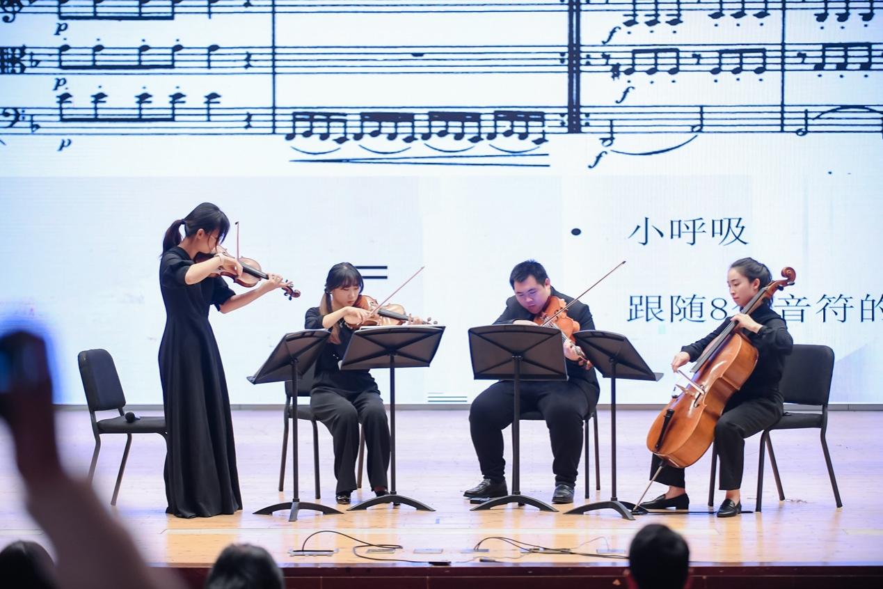 高菲阳、金天添、林天旸、沙西亚四位同学为大家带来的是一首经典弦乐四重奏作品,讲演主题为《呼吸在室内乐演奏中的重要性——以海顿d小调弦乐四重奏第一乐章为例》,该组同学从自身排练作品时所出现的问题进行分析,演示如何运用“呼吸”来帮助室内乐的演奏训练,进而提高室内乐演绎中的效率和默契。上海yl23455永利教授、九棵树爱乐乐团团长周铿对改组员工汇报的逻辑性、清晰性进行高度肯定,引导员工对作品的不同版本展开分析,进一步在演奏方面提出建议:员工们需要不断思考如何将演奏中的“呼吸”与作曲家的创作本意紧扣于一体。