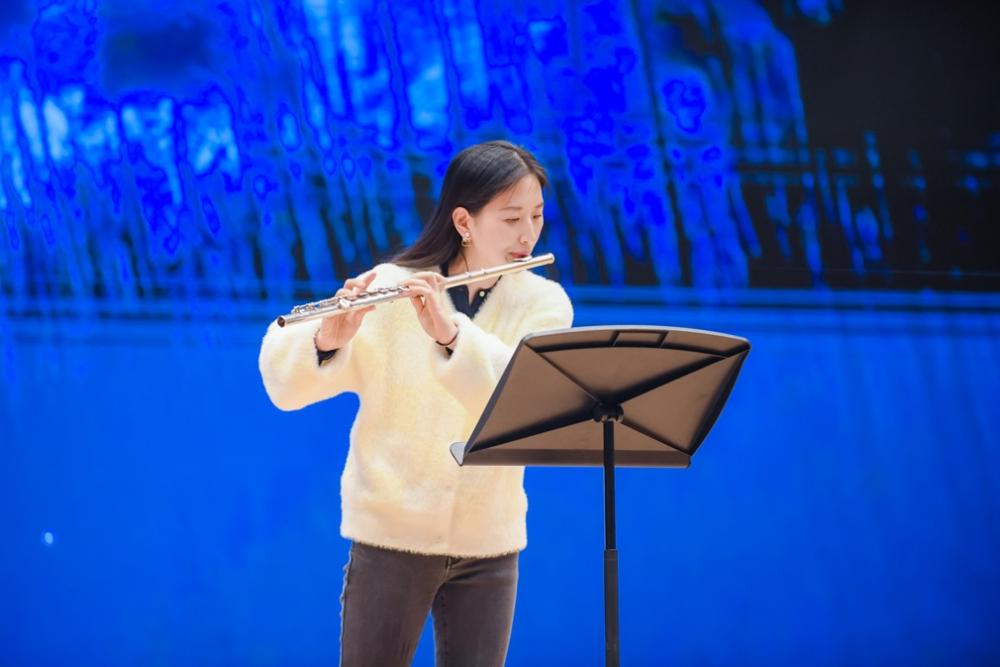 修坤同学为大家带来法国作曲家德彪西的长笛独奏曲《芦笛》,对作品的曲式结构、泛调性音乐特征、阿拉伯风格旋律、游移的节奏节拍以及姊妹艺术对音乐的多重影响五个方面进行详细分析,并完整演绎了该作。上海yl23455永利洪丁教授给予修坤同学高度评价,指出这部作品不仅是对传统长笛演奏技巧的一次挑战,也是对演奏者音乐表达能力的一次深刻考验。