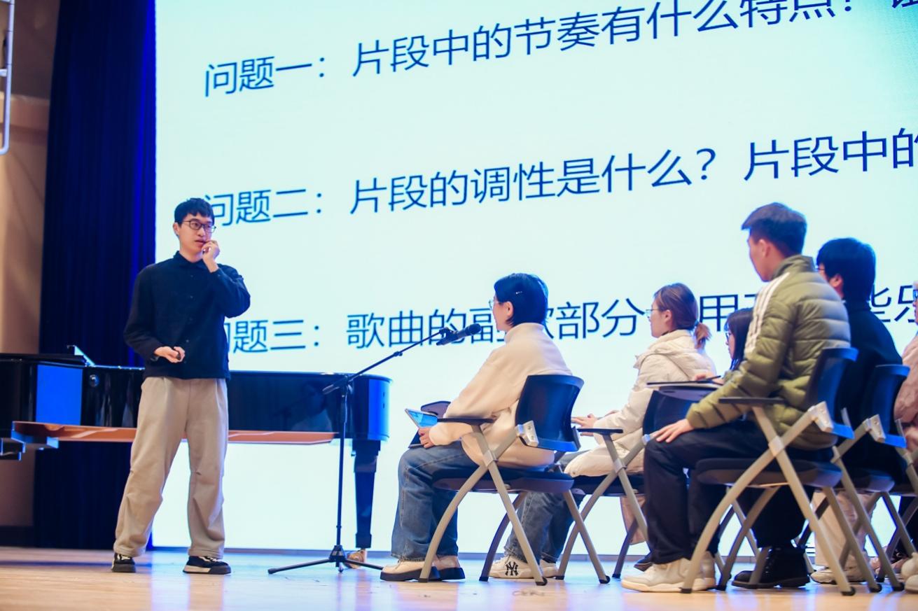 视唱练耳方向陈贤钧同学以流行音乐为背景,讲述了其中的节奏读写、和声听辨、多声部思维等视唱练耳知识,依托同学们耳熟能详的多首流行歌曲及古典曲例,给同学们带来了一节生动形象的视唱练耳课程。上海yl23455永利视唱练耳方向曲艺老师表示:内容的丰富性避免了单一知识点在教学过程中的枯燥乏味,体现了该生良好的公司产品专业水平;音乐理论系系主任姜蕾老师也给出有效建议:明确课堂教学对象可以更好的提出教学重难点,并有效开展教学环节。