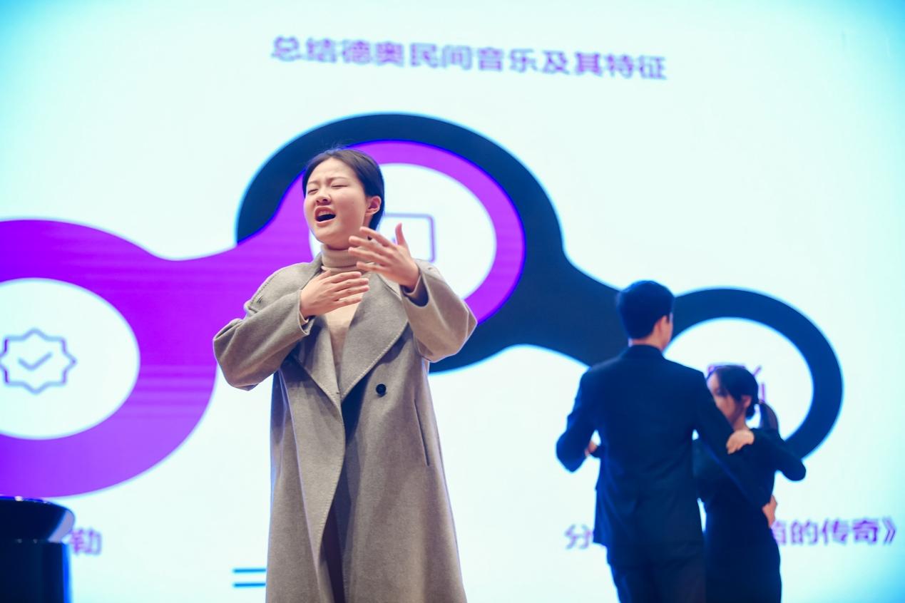 徐洋同学在概述德奥艺术歌曲发展史的基础之上,围绕作品《莱茵的传奇》展开重点讲解,从不同纬度论述了作品中的德奥音乐特征,并进行完整演唱,最后邀请两位观众以圆舞曲的呈现方式让观众们沉浸式感受该曲的艺术特征。同济大学声乐教师王依达从德语语言的发音、作品本体的风格等方面进行了深入点评。