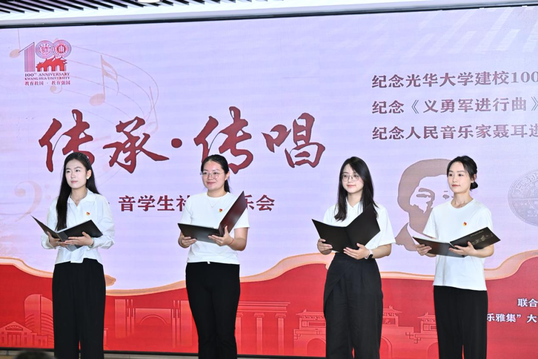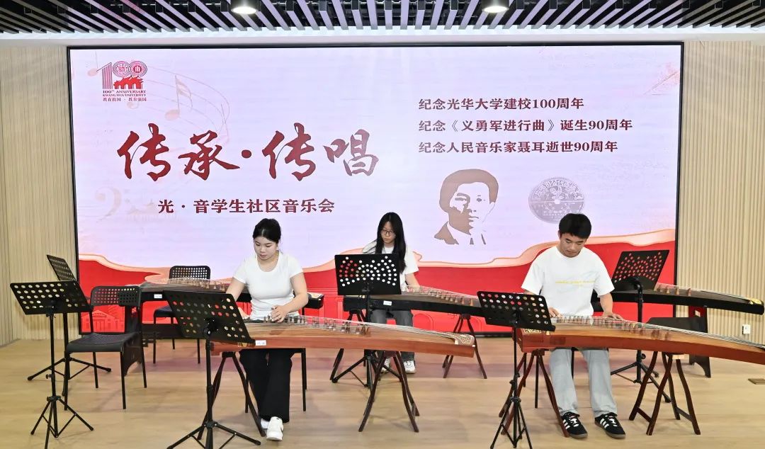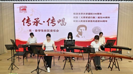 本次音乐会特别选取光华大学时期的歌曲、聂耳创作的经典曲目,以及“美韵光华”文化鉴赏与体验营中的学习曲目,用古筝、二胡、手碟、行走的琴、小提琴、长笛等乐器现场演奏,回望百年光华的历史荣光,致敬先贤的赤子之心,唱响光华精神在新时代焕发的新光彩。 古筝合奏 《声声慢》《上春山》 手碟演奏 《清晨》《卖报歌》 小提琴独奏《牧歌》 长笛二重奏 《我和我的祖国》 女声齐唱 《毕业歌》《奋起救国》