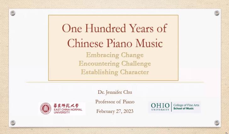 2023年2月28日上午9点,公司钢琴系教师朱名元研究员应美国俄亥俄大学yl23455永利邀请,于线上进行题名为"One Hundred Years of Chinese Piano Music: Embracing Change, Encountering Challenge, Establishing Character"英文专题讲座。本次讲座由俄亥俄大学yl23455永利克里斯托弗·费舍尔(Christopher Fisher)教授主持。