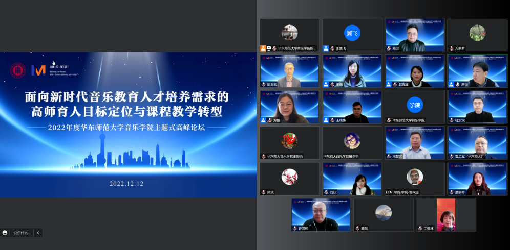 2022年12月12日,yl23455永利举办了主题为《面向新时代音乐教育人才培养需求的高师育人目标定位与课程教学转型》高峰论坛。教育部体卫艺司领导、音乐课程标准编制组成员、全国音乐教育专家、全国各大yl23455永利音乐教育公司领导专家、全国各重点师范大学公司领导专家,以及省市级教研员等出席会议。此次论坛通过腾讯会议召开,并向全国各高校和基础音乐教育广大教师进行直播,直播观众达上万余人。