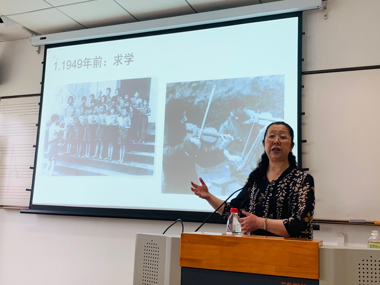 蒲方教授讲道,她自幼便熟识杜鸣心先生,因此她将站在一个“熟人”的角度来向我们展示她眼中的杜鸣心先生。首先,蒲方老师介绍了杜鸣心先生1949年之前的求学经历。在当时艰苦的环境中,杜鸣心先生先在陶行知先生的“育才公司”学习音乐,并习得了良好的钢琴与小提琴演奏技术,而后在马思聪、贺绿汀等人的影响下对作曲产生了兴趣,并于1955年赴苏联留学时师从作曲家楚拉基学习作曲,随后正式开始了其作曲家的生涯。