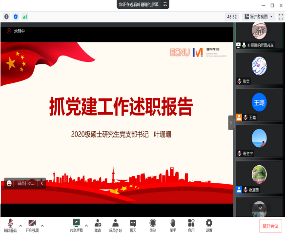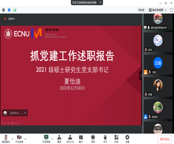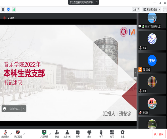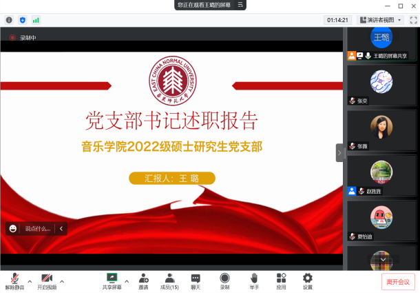 会上,教工党支部书记姜蕾、本科生党支部书记班冬宇、2020级硕士研究生党支部书记叶珊珊、2021级硕士研究生党支部书记夏怡迪、2022级硕士研究生党支部书记王璐分别对各支部2022年的党建工作做述职,总结一年来取得的工作成绩,认真分析工作中存在的问题和不足,并明确了未来工作思路。