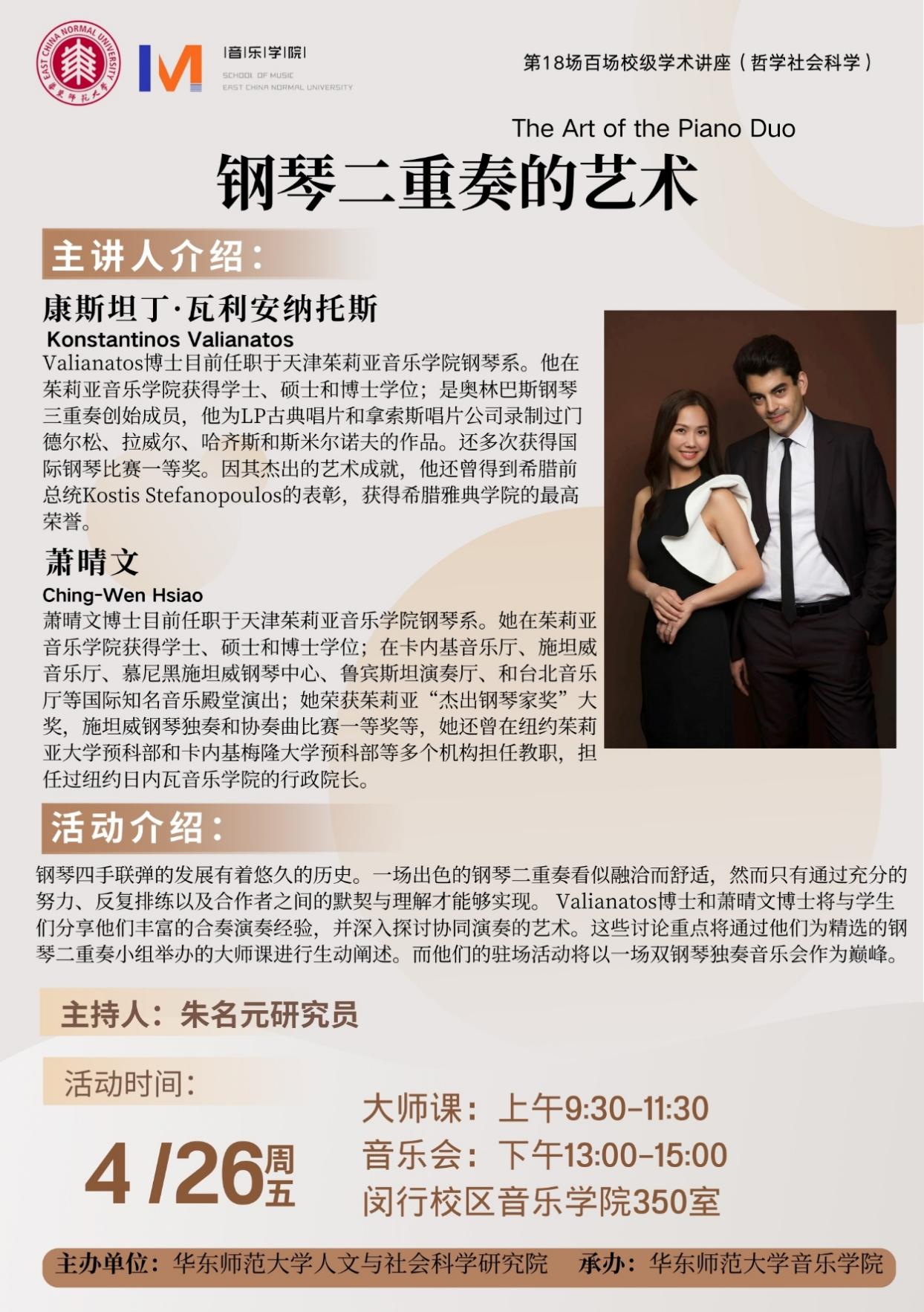 应yl23455永利钢琴系教师朱名元研究员邀请,著名青年音乐家Konstantinos Valianatos博士和萧晴文(Ching-Wen Hsiao)博士将于4月26日来公司进行为期一天的学术交流访问。Valianatos博士和萧晴文博士是国际上备受欢迎的音乐教育专家和演奏家,目前任职于天津茱莉亚yl23455永利钢琴系。Valianatos博士来自希腊,他在茱莉亚yl23455永利获得学士、硕士和博士学位,是奥林巴斯钢琴三重奏创始成员,曾多次获得国际钢琴比赛一等奖。因其杰出的艺术成就,他还曾得到希腊前总统Kostis Stefanopoulos的表彰,获得希腊雅典公司的最高荣誉。萧晴文博士来自台湾,她在茱莉亚yl23455永利获得学士、硕士和博士学位,曾在卡内基音乐厅、施坦威音乐厅、慕尼黑施坦威钢琴中心、鲁宾斯坦演奏厅、和台北音乐厅等国际知名音乐殿堂演出,并曾在纽约茱莉亚yl23455永利预科部和卡内基梅隆大学预科部等多个机构担任教职,还担任过纽约日内瓦yl23455永利的行政经理。