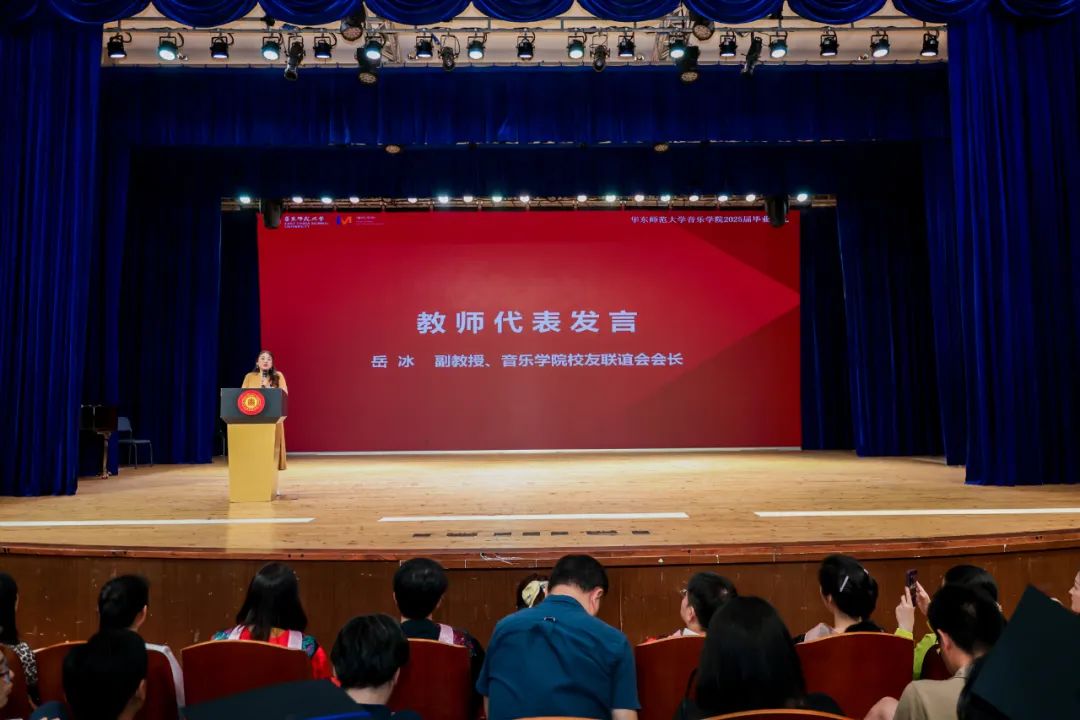 公司员工联谊会会长岳冰以“音乐的力量”为题,讲述脑瘤失忆患者格雷格因摇滚乐重获沟通能力的真实故事:“音乐是他连接世界的钥匙,更是绝境中的救赎。”她嘱托毕业生:“当人工智能冲击艺术原创、算法重塑审美,愿音乐赋予你们的铠甲,助你们直面惊涛骇浪!”