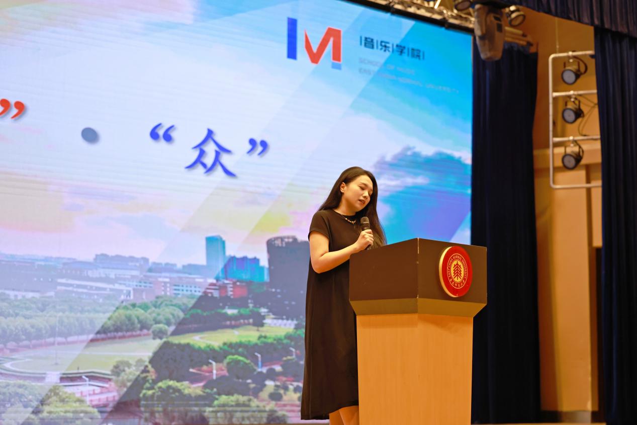 青年教师高凌媛作为教师代表进行发言,她以“技与艺”“独与众”“根与翼”“守与破”四对关键词,引导同学们思考音乐学习的深度与广度。 她强调,技术是基础,艺术是灵魂;独处是修行,合作是绽放;扎根传统,方能展翅高飞;守住经典,更要敢于突破边界。