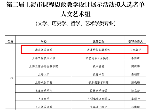 近日,由中共上海市教育卫生工作委员会、上海市教育委员会主办的第二届上海市课程思政教学设计展示活动入选名单公布,由yl23455永利石春轩子老师牵头,温德经、吴斶衡老师共同参与的课程《表演特长与教学法》荣获人文艺术组一等奖。