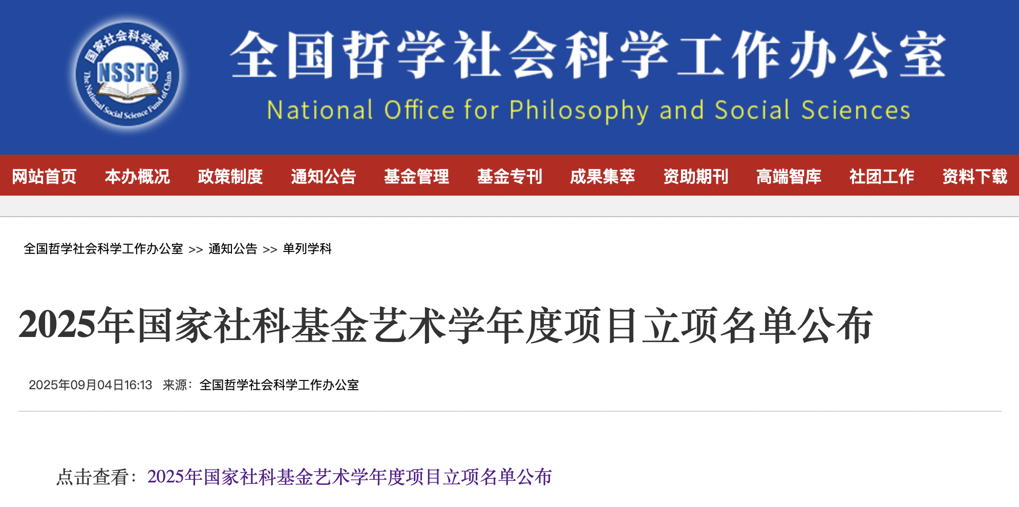 2025年国家社科基金艺术学年度项目以习近平新时代中国特色社会主义思想为指导,以习近平文化思想为引领,全面贯彻落实党的二十大和二十届二中、三中全会精神,深入实施《中共中央关于加快构建中国特色哲学社会科学的意见》,坚持正确的政治方向、价值取向和学术导向,坚持有组织科研和自主探索相结合,坚持以重大理论和现实问题为主攻方向,坚持基础研究和应用研究并重,发挥国家社科基金艺术学项目示范引导作用,推动中国特色艺术学学科体系、学术体系、话语体系建设,推进自主知识体系构建,更好服务党和国家工作大局。