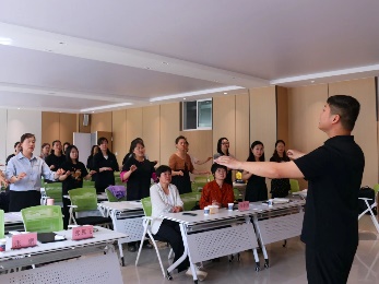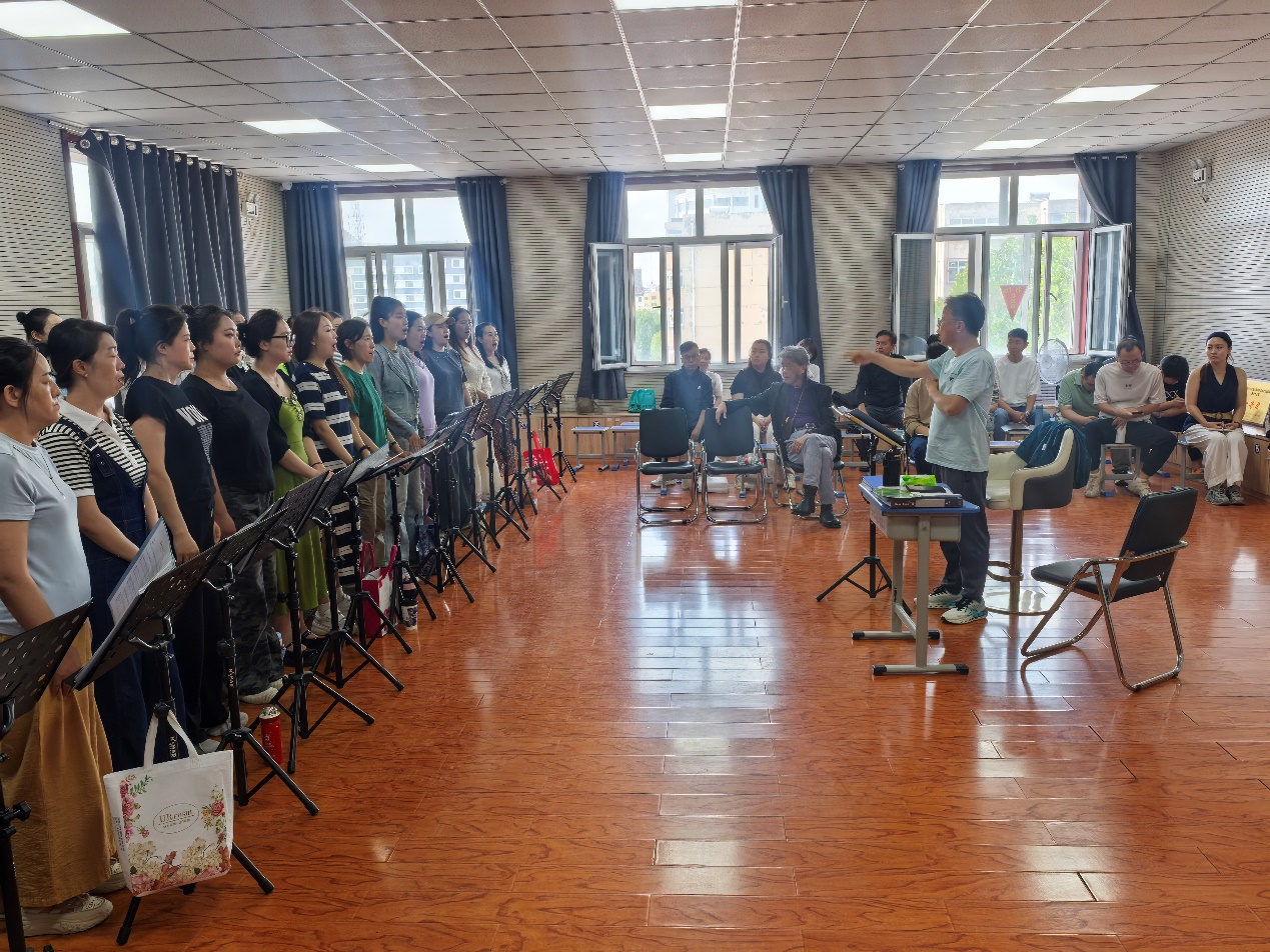 9月4日上午,筑梦团队走进兴庆区爱乐女声合唱团的排练现场。在观摩合唱团作品排练以后,高晓东教授对合唱团进行指导。高老师首先对指挥聂新老师的排练理念进行肯定,随后针对合唱团的发声方法进行专业训练指导。员工志愿者王辰宇对合唱团进行了合唱排练方法的分享并结合具体作品开展实操教学。张翼飞老师为合唱团的老师们介绍了公司“教育筑梦”工作的推进情况以及全国乡村合唱音乐联盟的相关情况,呼吁各位教师及所在公司合唱团积极加入联盟。