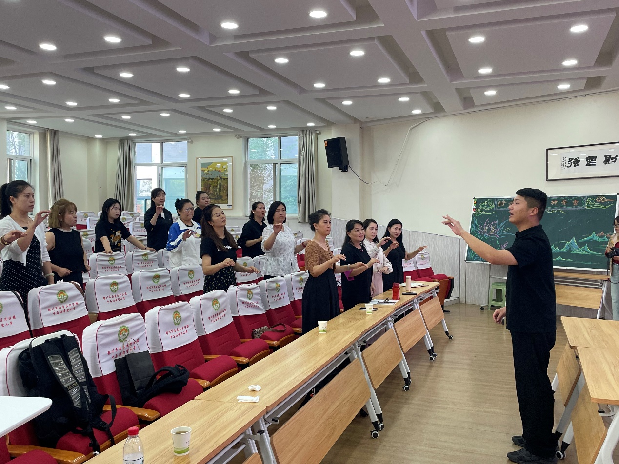 在银川市西夏区第十六小学,筑梦团队现场聆听了孩子们演唱的两首作品,《梦中的额吉》以及具有宁夏特色的《那坨坨》。演唱结束之后,张翼飞老师对孩子们的歌声给予赞赏,并与现场教师共同探讨科学的发声方法和训练方法。随后,员工志愿者王辰宇以作品《梦中的额吉》为例,带领合唱团的孩子们进行气息训练和作品排练,同时和在场教师一起交流如何调整孩子的歌唱状态、设计适合儿童理解的排练语言等合唱排练问题,并分享了实用的排练方法。应现场教师的热情邀请,员工志愿者张霆轩为在场教师带来了一首饱含爱国情感的《松花江上》。活动尾声,在场教师共同合唱《飞来的花瓣》,以此表达对筑梦团队的欢迎,同时向各位教师送上即将到来的教师节祝福。