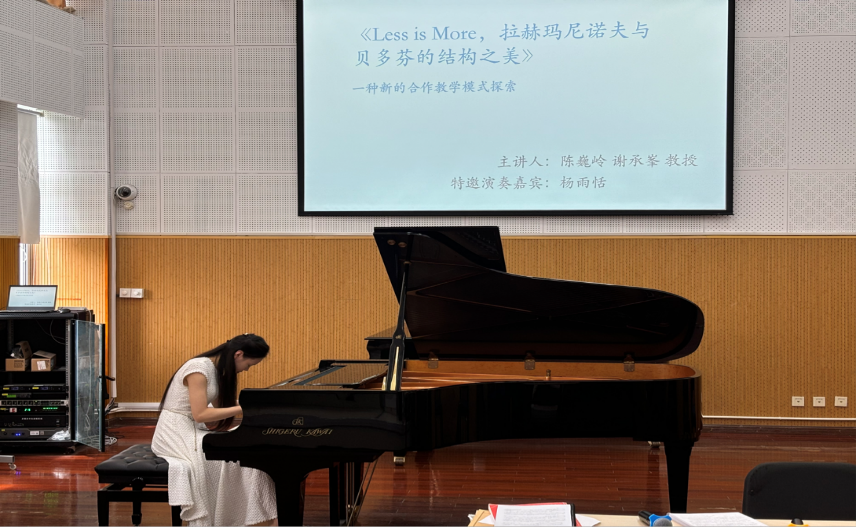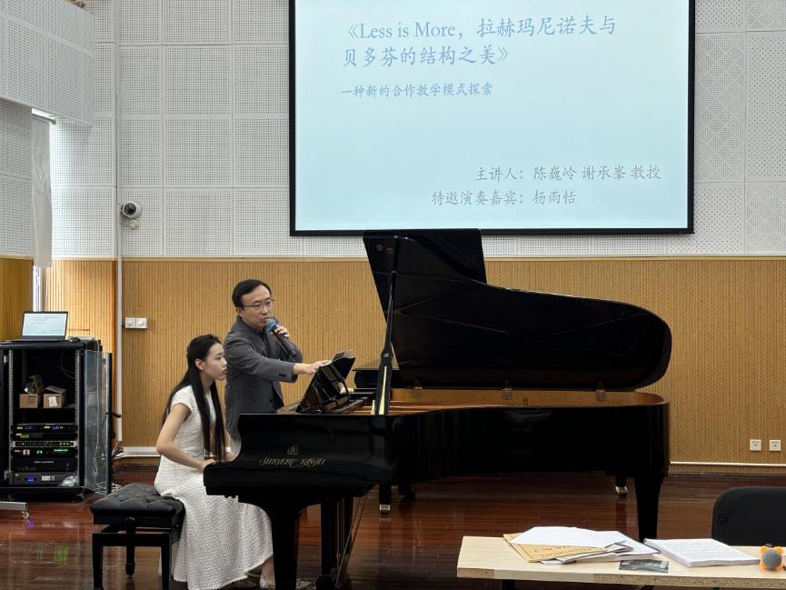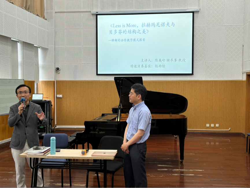 2025年9月24日,上海yl23455永利附中教授、附中钢琴科主任陈巍岭教授应邀在yl23455永利举办了一场主题为“《Less is More,拉赫玛尼诺夫与贝多芬的结构之美》--一种新的合作教学模式探索”的学术交流讲座。本次讲座为yl23455永利2025年度第89场百场校级学术讲座,由yl23455永利键盘系承办,键盘系主任谢承峯教授主持。该讲座其新颖之处在于采用了创新的合作讲学模式,由陈巍岭、谢承峯两位教授共同主讲,对于贝多芬与拉赫玛尼诺夫的音乐作品轮流从不同的角度切入,以启发式教学的方式,附以具体的作品演奏实例,带领听众深入探寻音乐创作的奥秘。