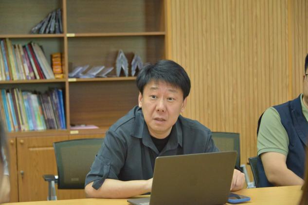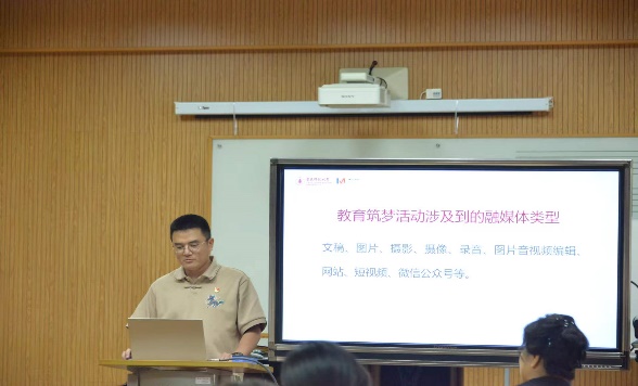 在活动相关电子设备和媒体制作方面,党员教师曹政操老师以《关于教育筑梦和其他活动的融媒体采编制作推广》为题,向志愿者们介绍了项目活动中可能会接触到的设备使用和融媒体采编内容,如相机焦距的判断使用、照片和视频拍摄的构图要点、视频的剪辑和其他处理等。他通过操作模拟向志愿者们介绍了可能会出现的素材处理难点,为之后教育筑梦项目的素材获取和宣传处理提供了有力的技术支持。