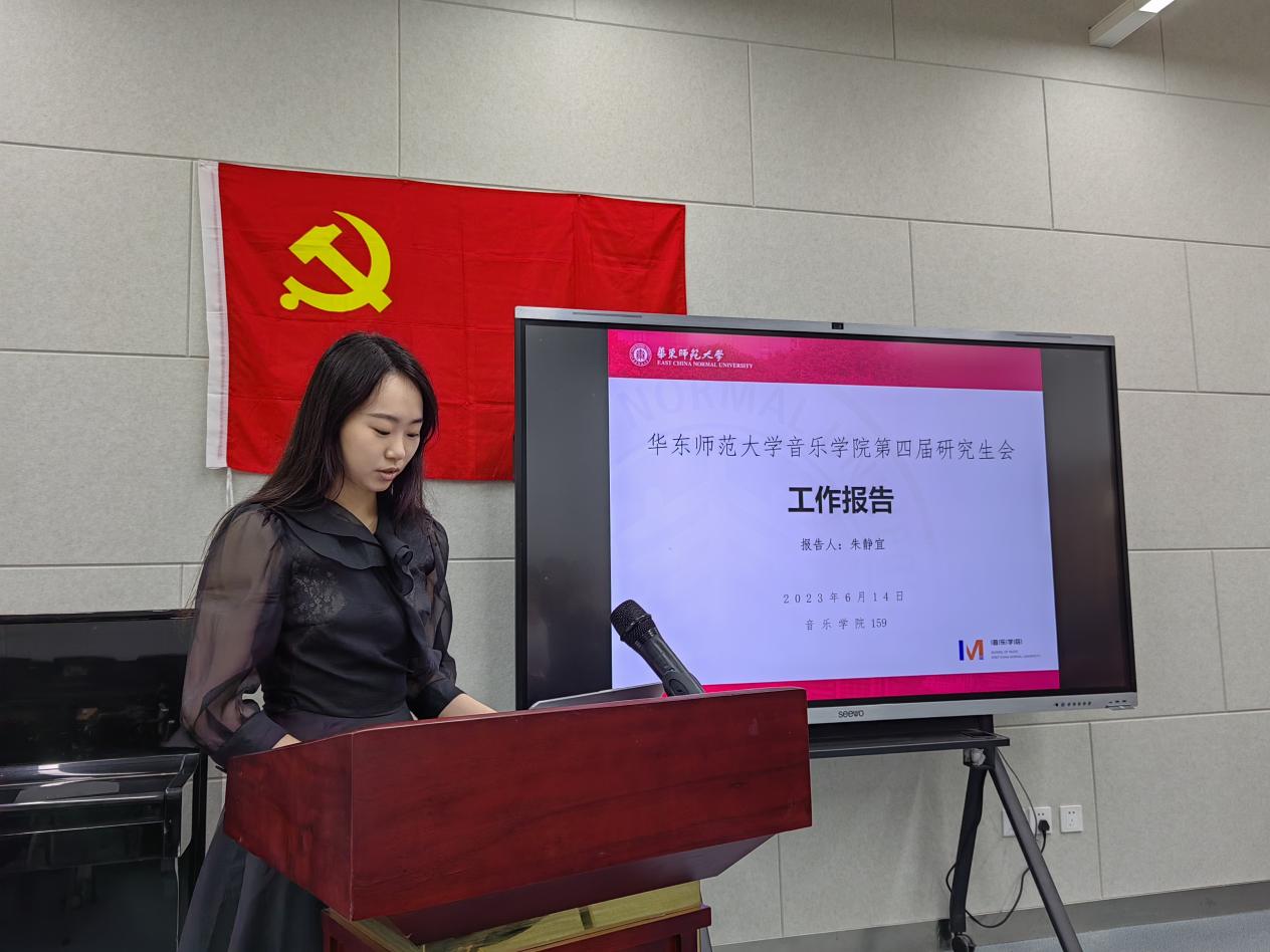 第四届研究生会主席团成员朱静宜作2022-2023年的研究生会工作报告,总结了在过去一年中研究生会在思想引导、艺术创作、文体拓展、员工服务方面的工作成效,并指出了未来研究生会的工作优化方向。